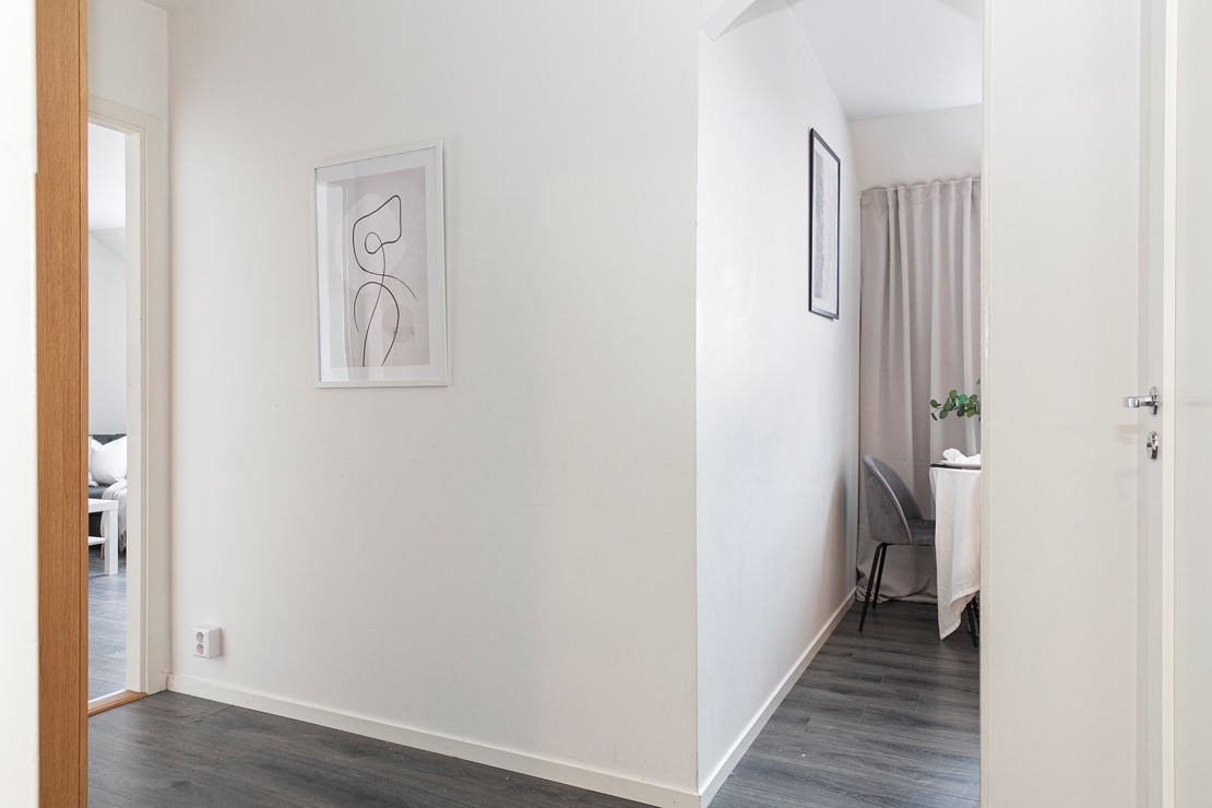 Utöver det härliga köket får ni ett stambytt badrum som blivit helkaklat i vit/gråa toner med stor duschhörna. Luftig hall med platsbyggd garderobslösning för enkel förvaring av såväl ytterkläder som vardagskläder. Vardagsrummet erbjuder er bra möjligheter för möblering av större soffgrupp och tv-hörna eller varför inte få in en gaming/kontorshörna om så önskas, låt fantasin flöda!
