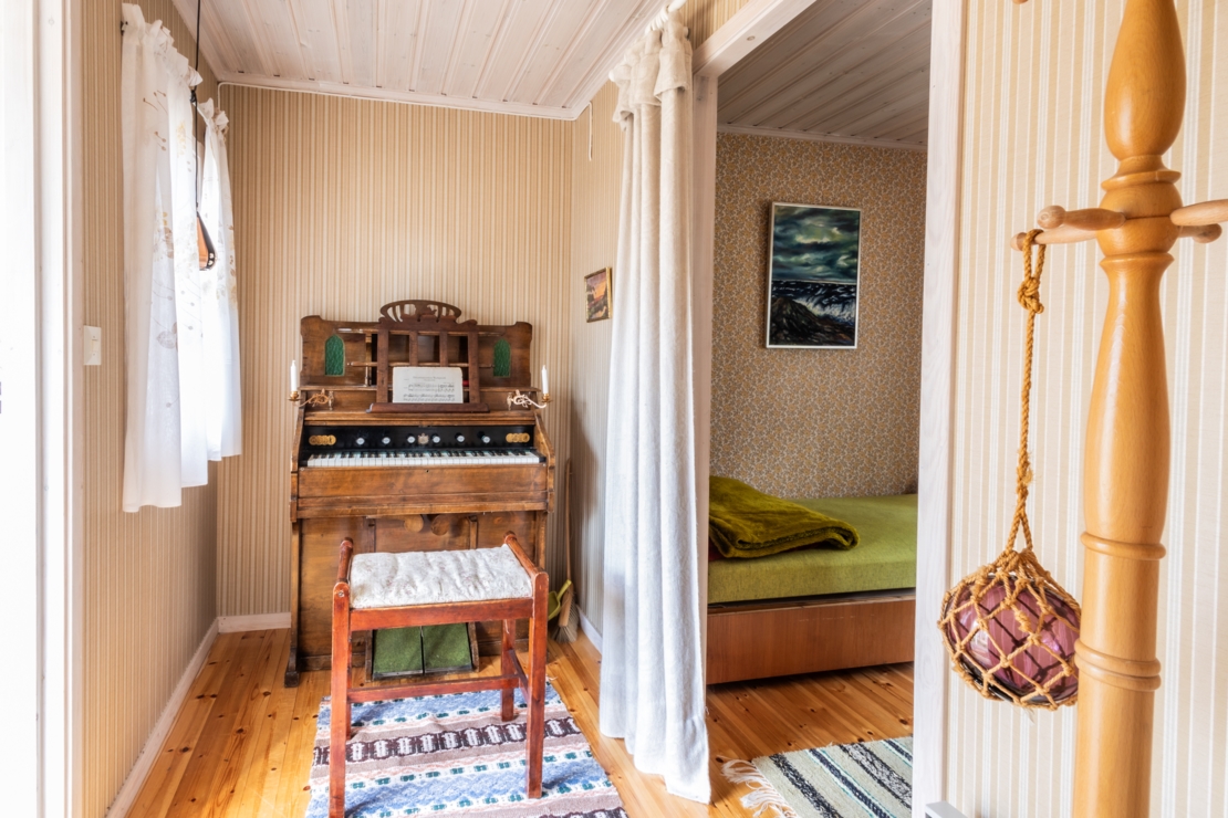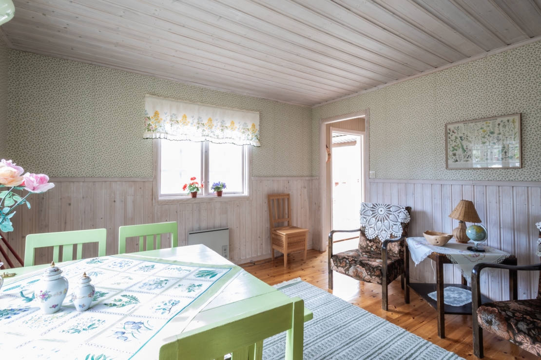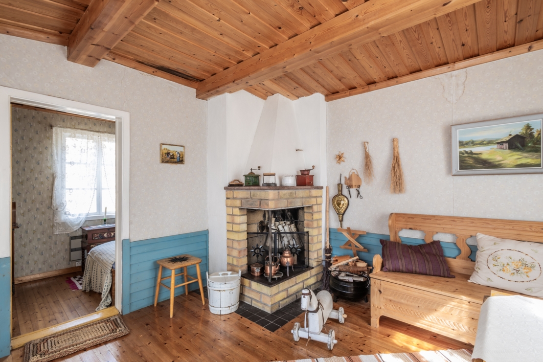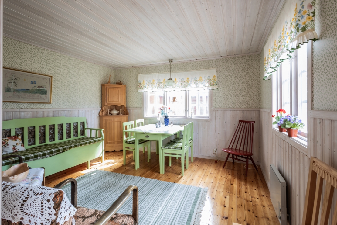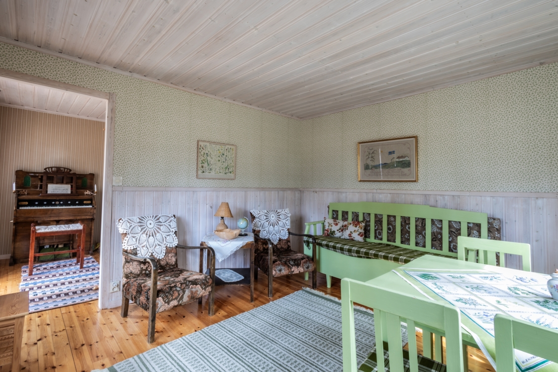 Huvudbyggnaden är i välbevarat skick och har permanentboendestandard. På bottenvåningen finns ett hemtrevligt kök, två fina rum och en toalett. Ett av rummen har en vacker kakelugn (ej besiktad), perfekt för mysiga kvällar. På övre plan hittar du ett större allrum och ett mindre sovrum samt ett badrum. (Observera att järnspisen i köket för närvarande är ur funktion.)