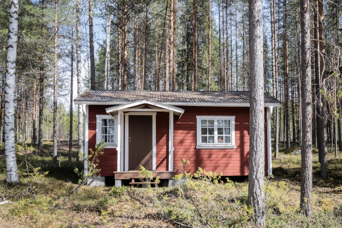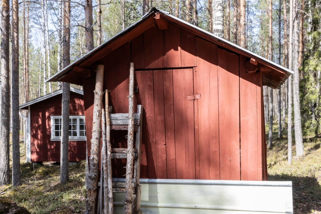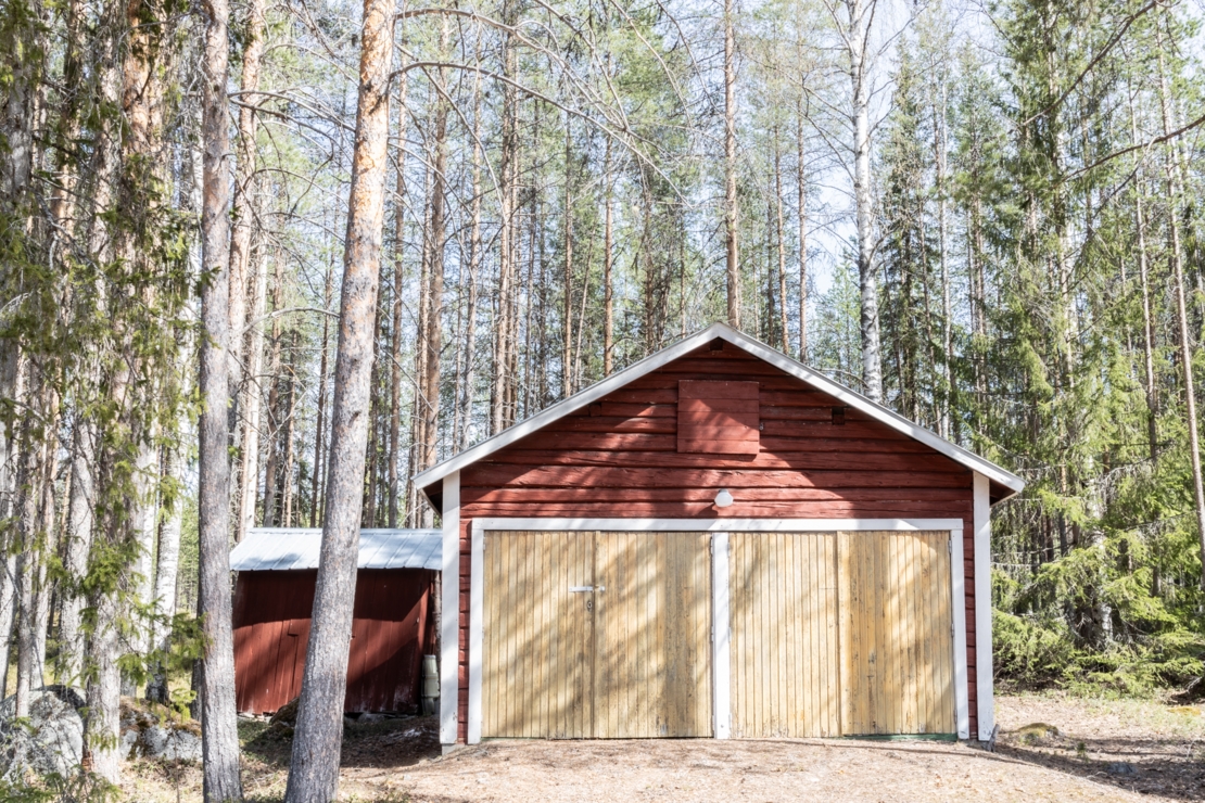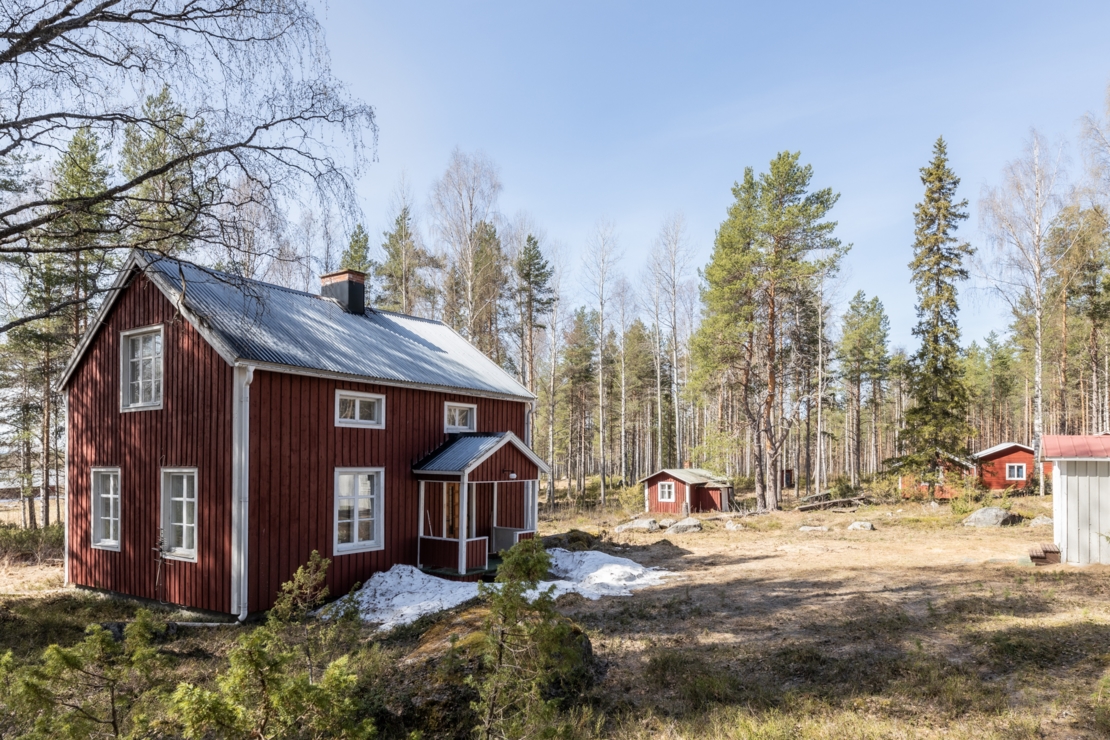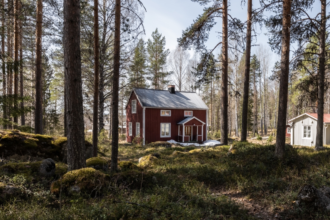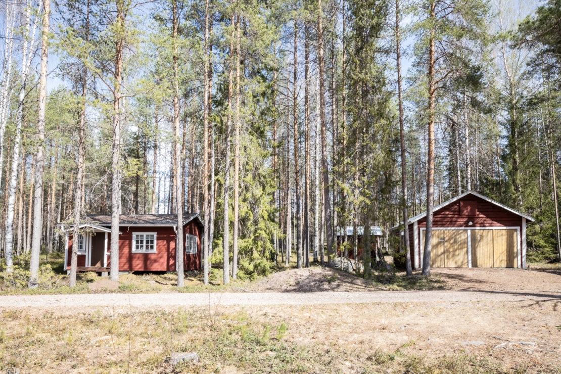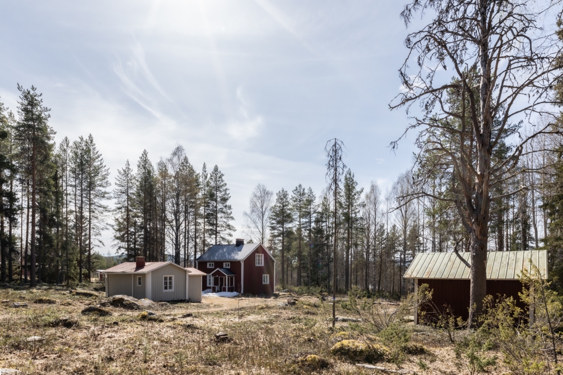 Fridfull gård med huvudbyggnad, två stugor, bastu och dubbelgarage omgiven av skog