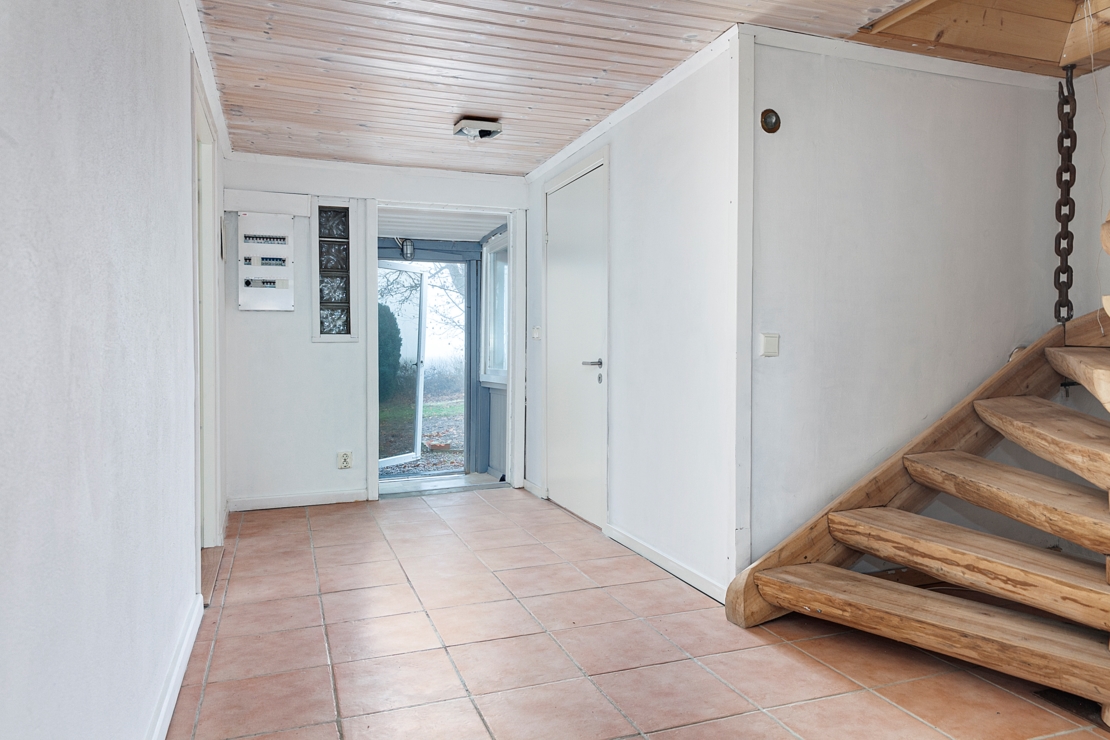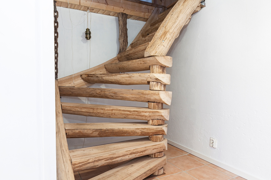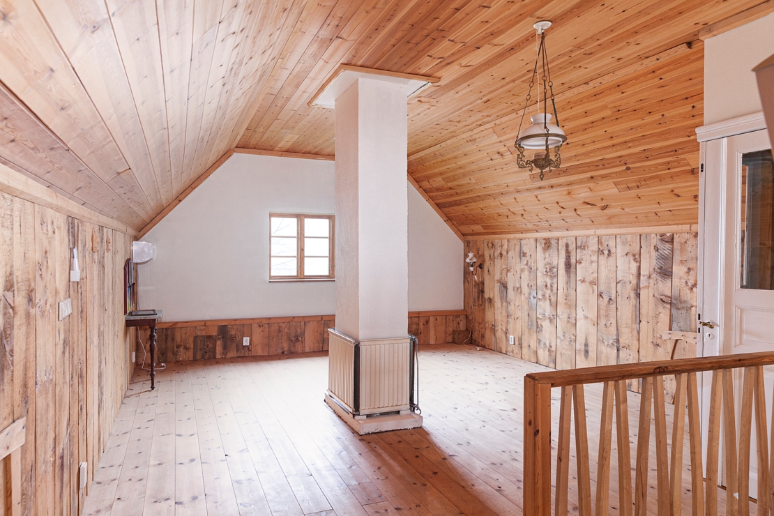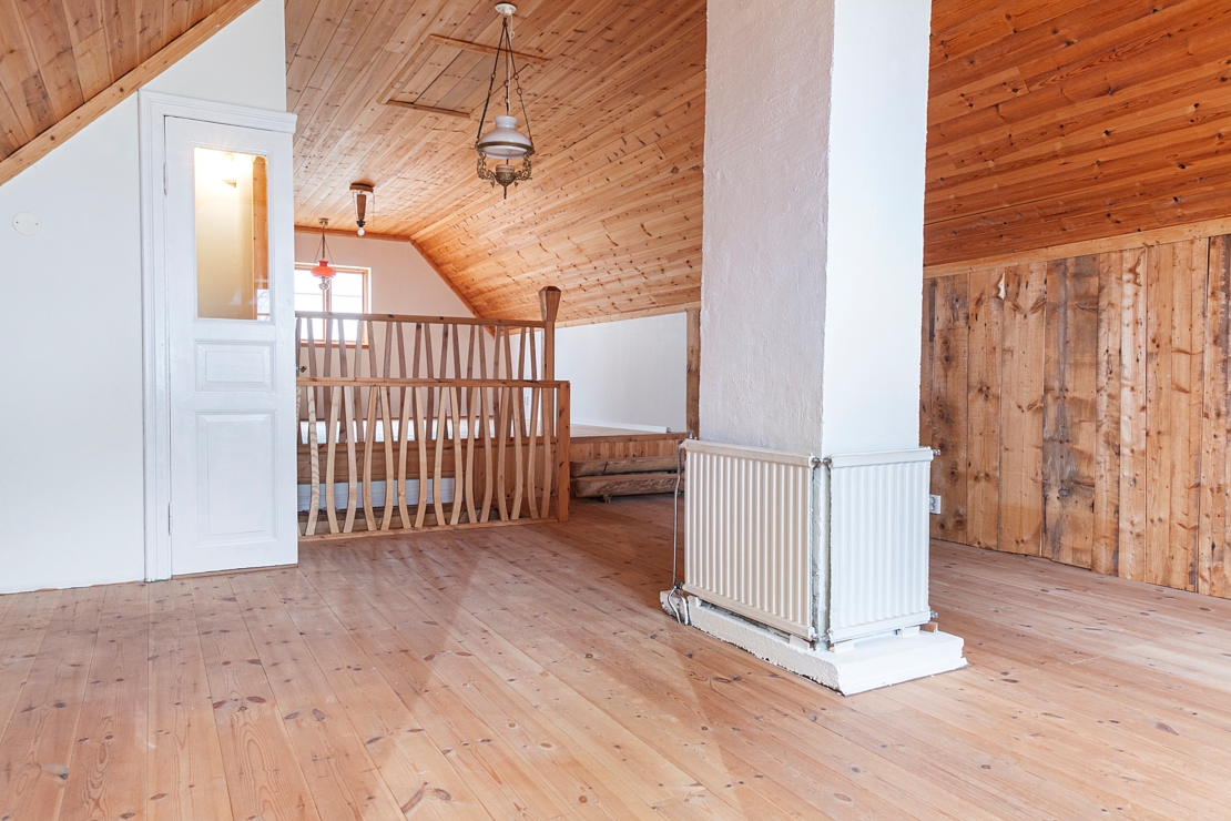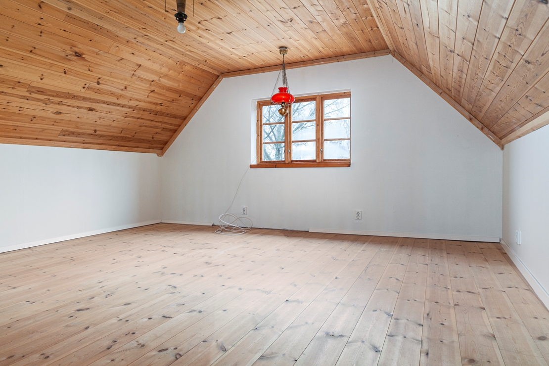 Via den vackra trappan når vi upp till bostadens andra plan. Hör möts av fina detaljer i trä som exempel ett fint trägolv, handgjorda träräcken och utsikt över naturen. Det är en stor och öppen planlösning där ni verkligen har chans att sätta er egen prägel på hur de ska se ut. Vill ni kanske skapa två stora sovrum eller ett sovrum och ett allrum, alla möjligheter finns!