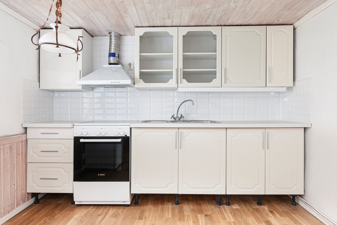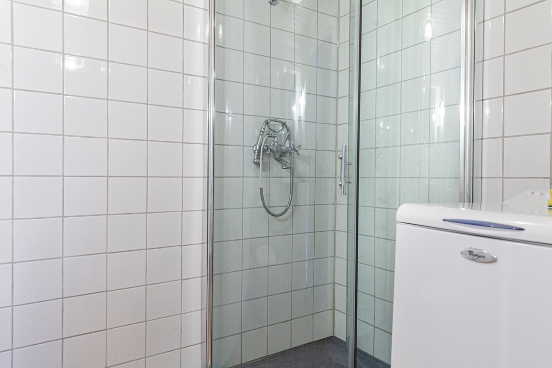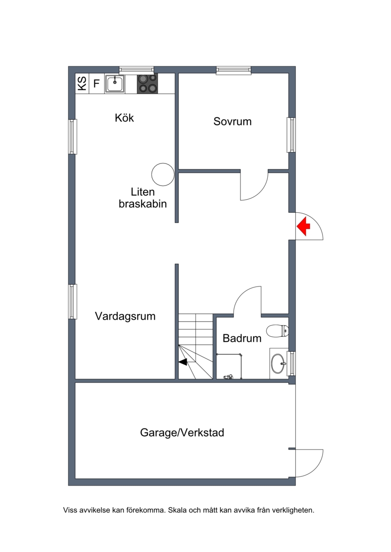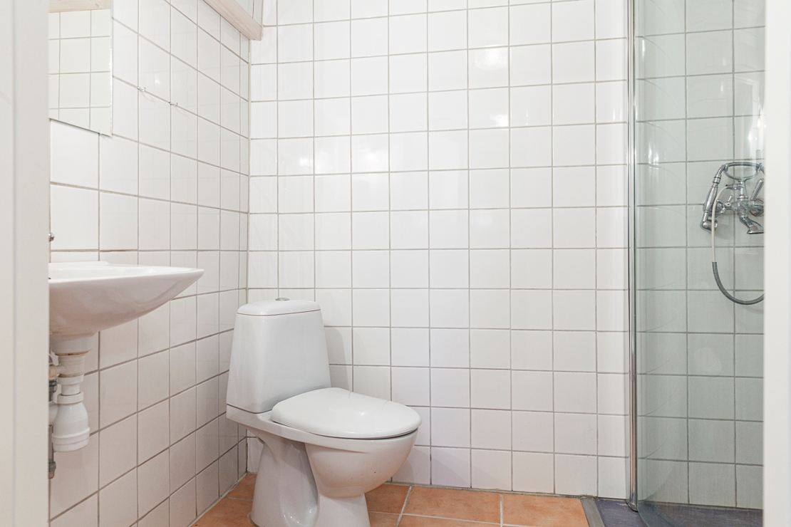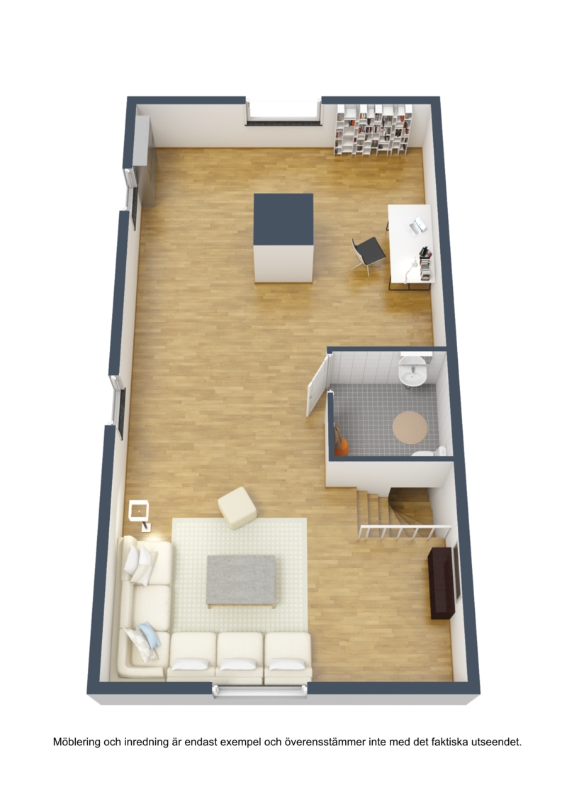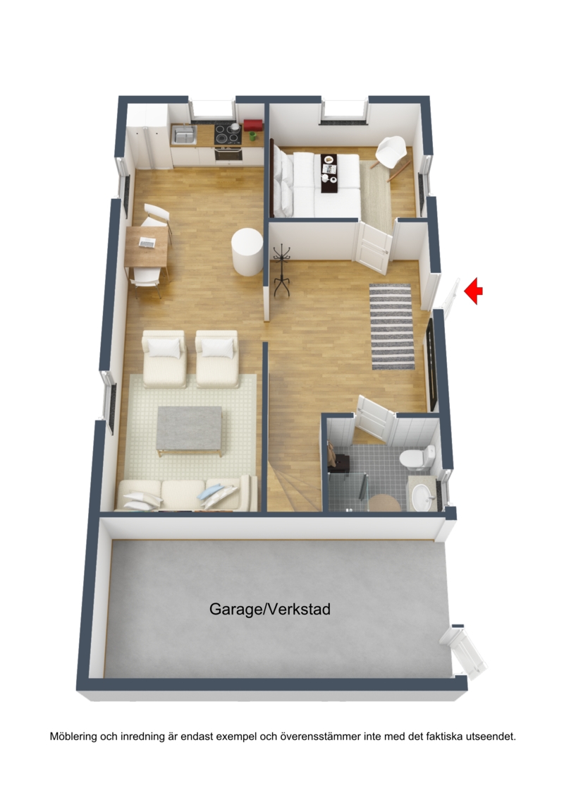 Inne i huset når vi hallen som har ett genomgående stilrent parkettgolv med ett härligt värmegolv genom hall och de öppna kök & allrummet. På detta plan finner vi ett stort och luftig sovrum med möjlighet plats för större säng, nattduksbord samt egen garderobslösning. Ett helkaklat badrum utrustat med duschhörna, wc, kommod och spegel samt tvättmaskin. Vidare har vi ett luftigt vardagsrum/kök med öppen planlösning, ett vitt kök i lantlig still och härligt ljusinsläpp.