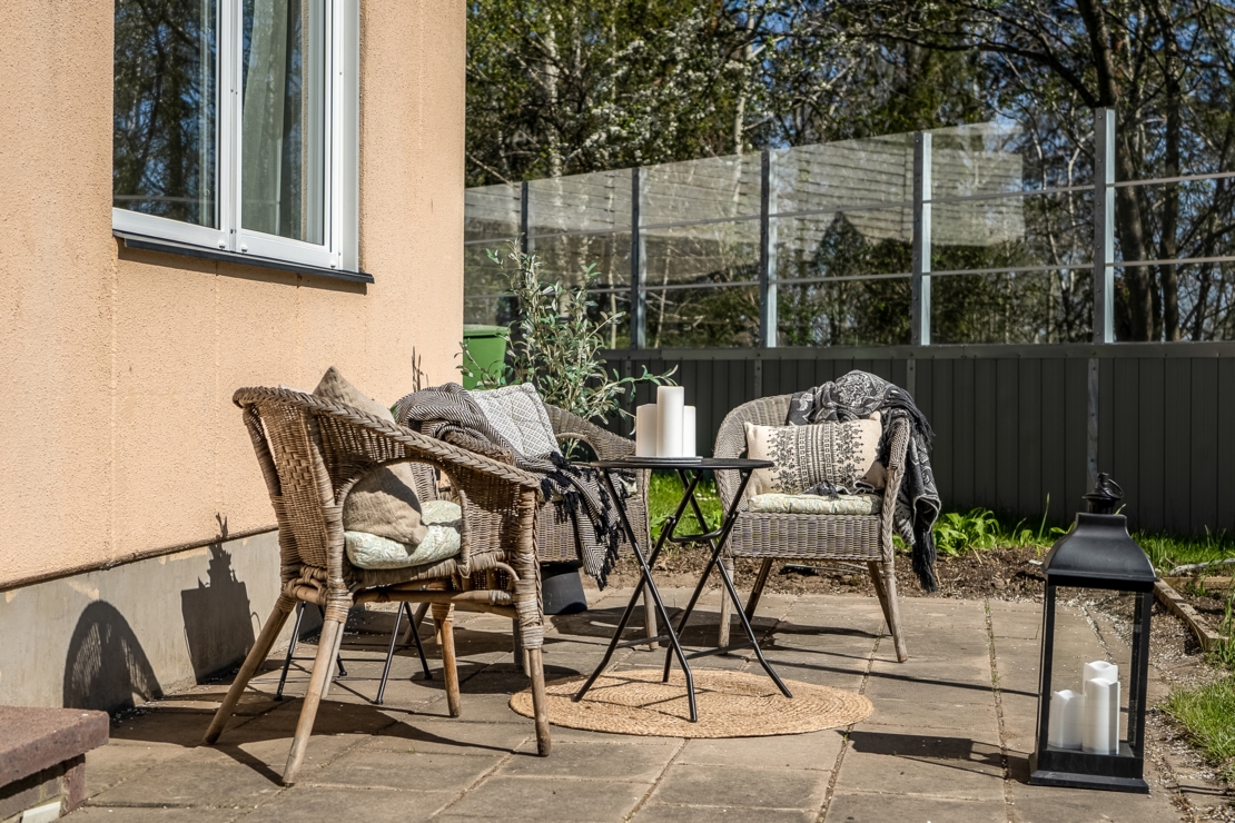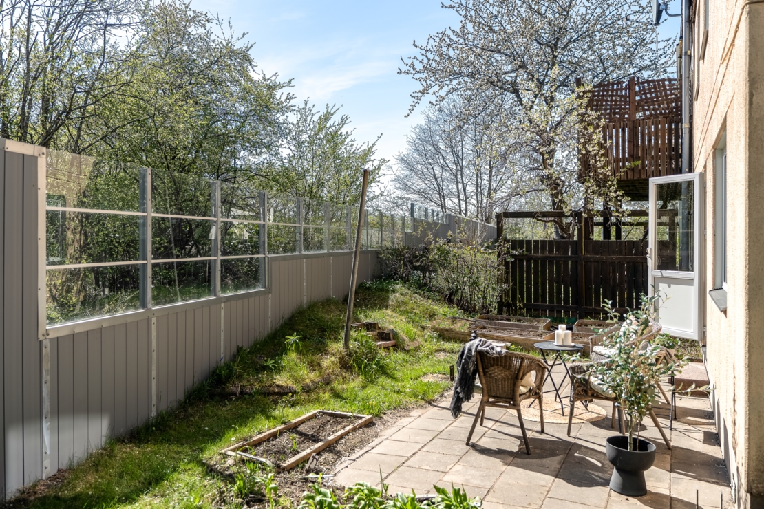 Mycket trevlig baksida som man når via utgången från vardagsrummet. Baksidan består dels i ett trevligt altandäck, följt av er egen trädgård som ger möjlighet till lek och odling av egna grödor. Det ogenerade läget ger möjlighet att umgås i lugn och ro. Här kan ni njuta av solen från morgon till sen eftermiddag.