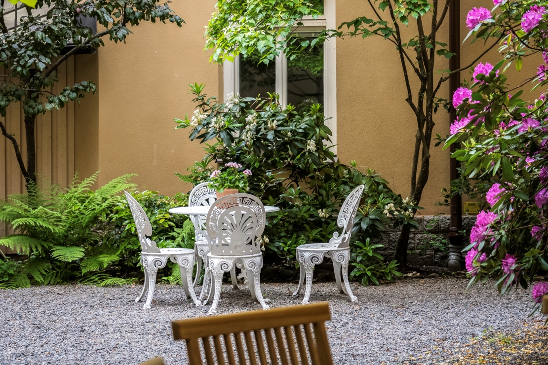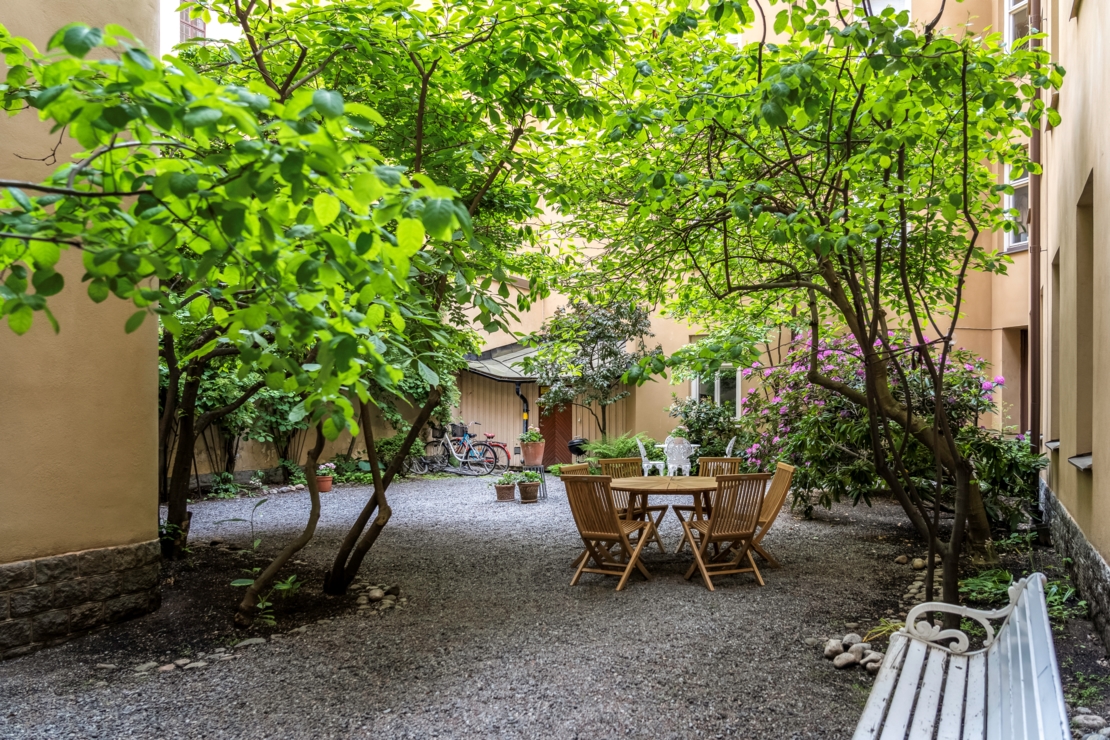 Innergård med Magnaoliaträd, trädgårdsmöbler, grill och cykelställ.