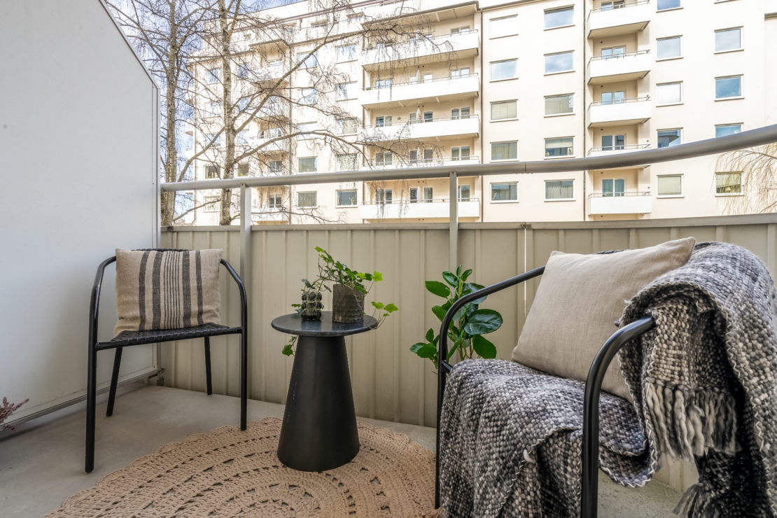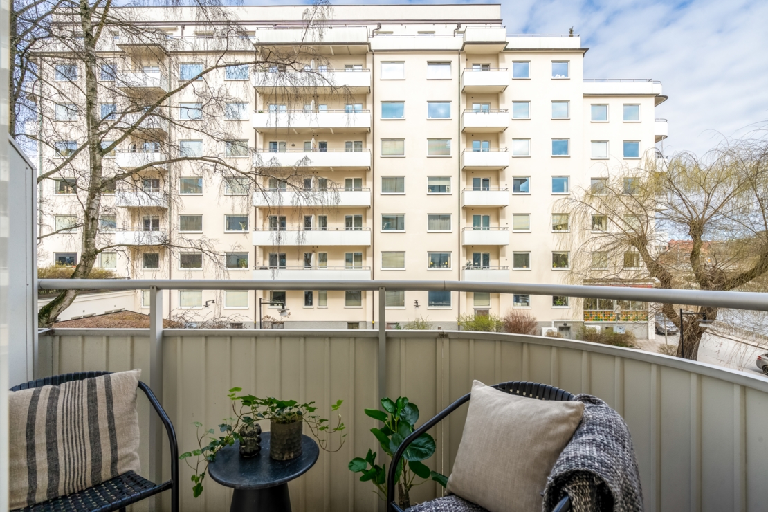 Stor balkong som skapar trivsam känsla sommartid. Gott om plats för utemöbler samt plantering.