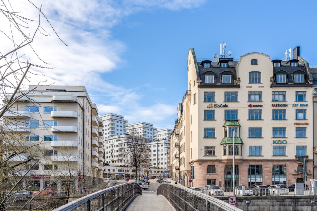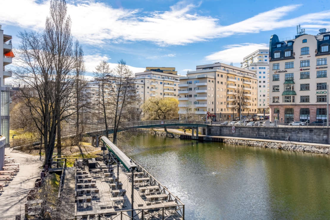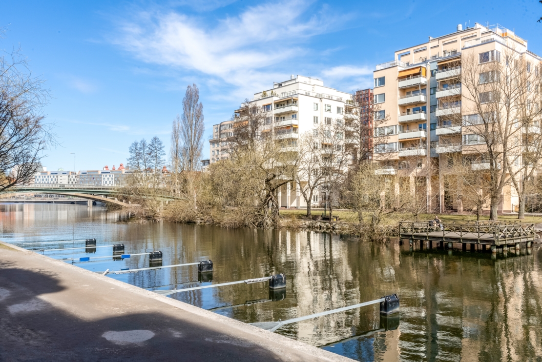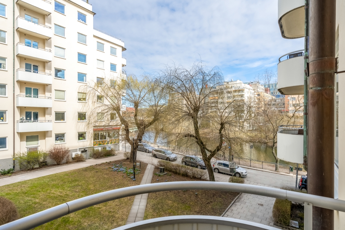 Lägenheten bjuder på en social öppen planlösning med kök, vardagsrum och matplats. Väl tilltaget sovrum med utgång till stor balkong med utsikt mot Karlbergskanalen.
