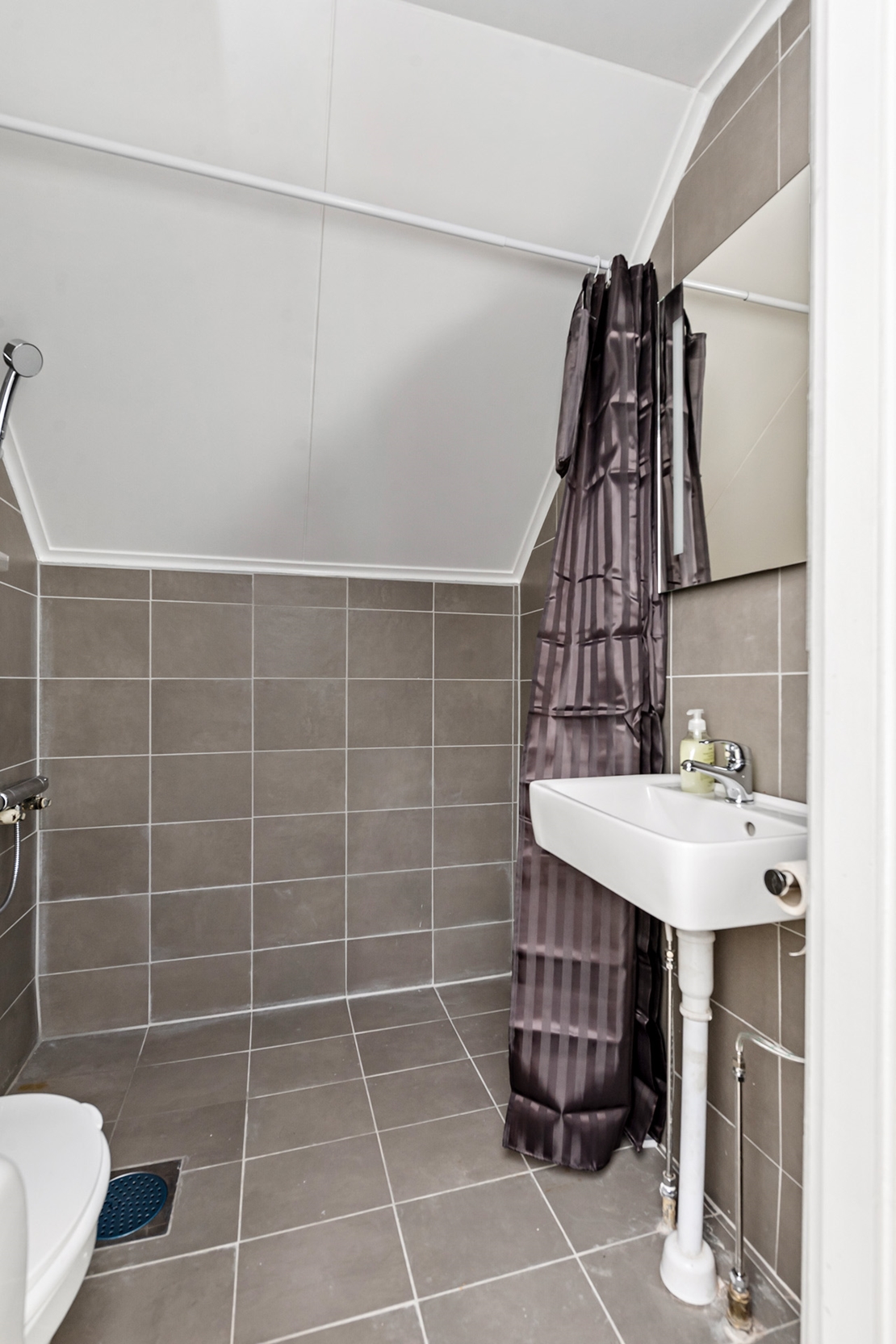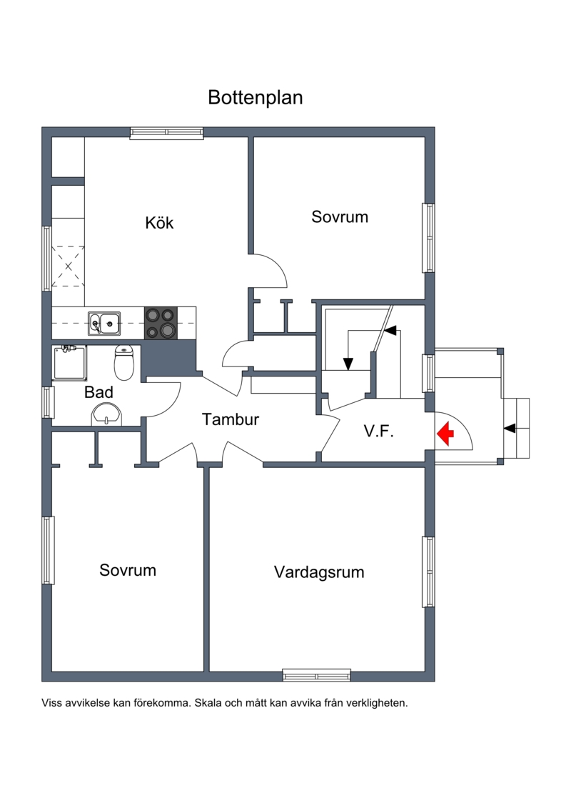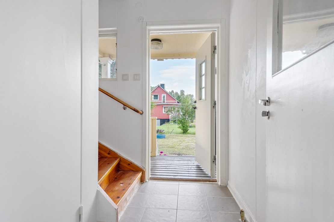 På entréplan finns 3 rum och kök samt badrum med toalett och dusch.