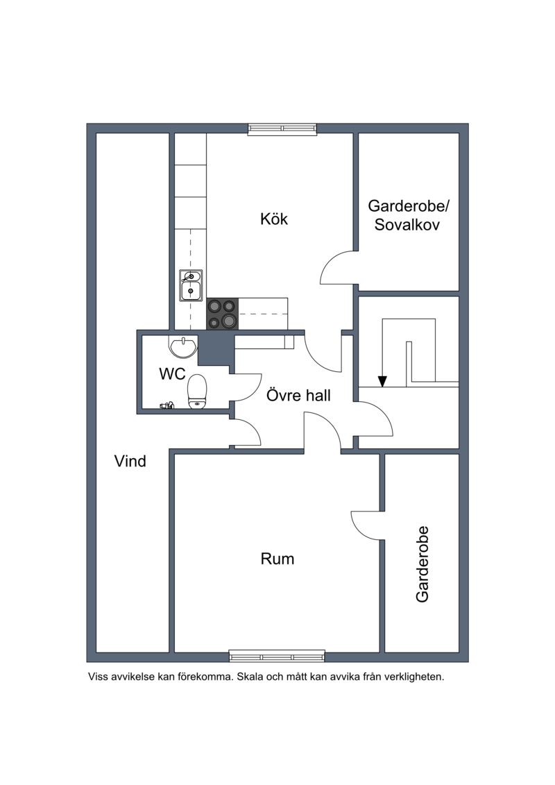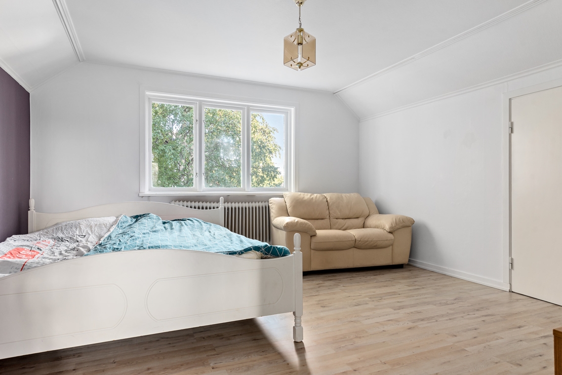 På övrevåningen finns ett större sovrum, badrum, extra kök (eventuellt sovrum), och sovalkov/förråd.