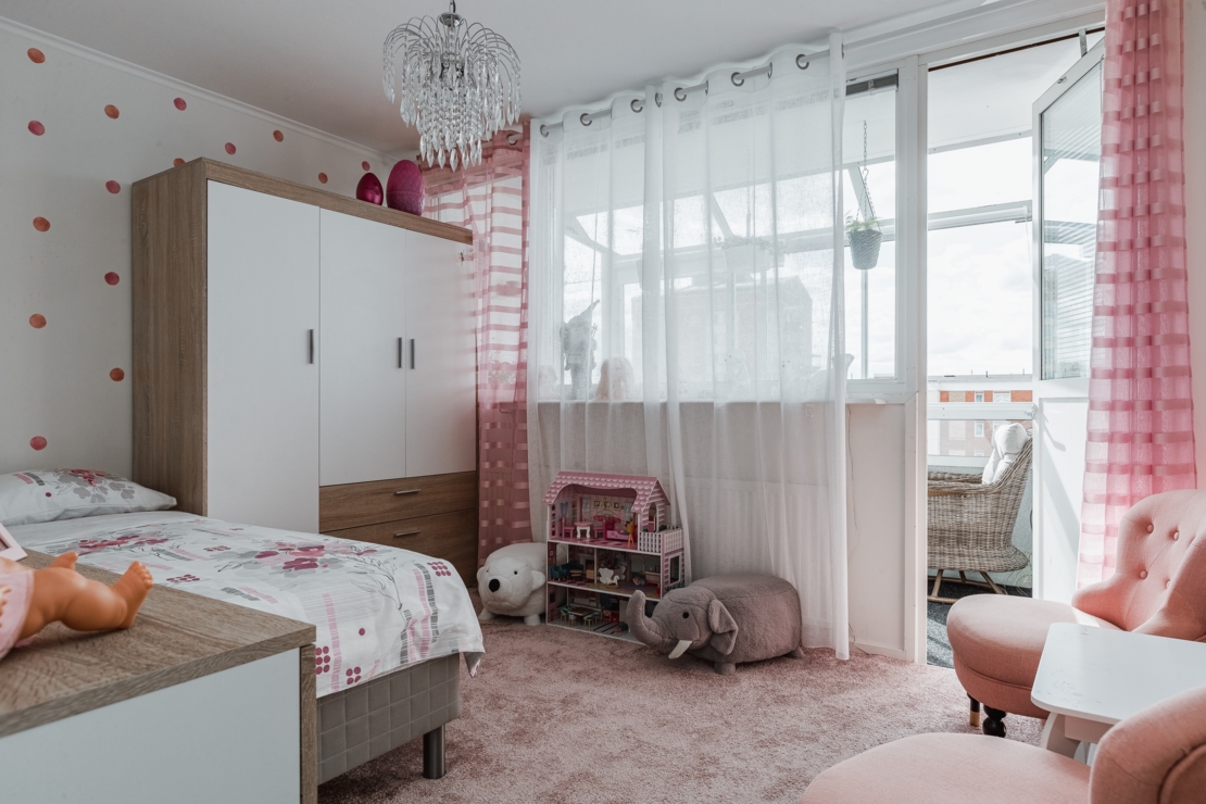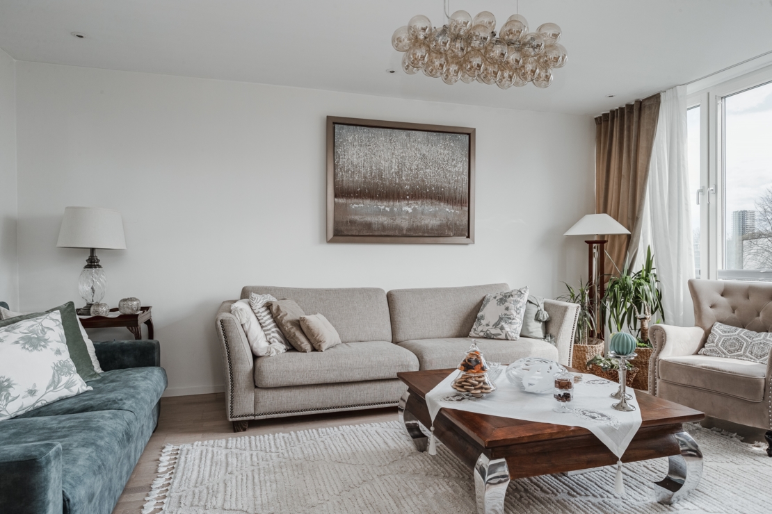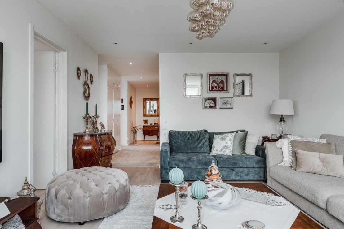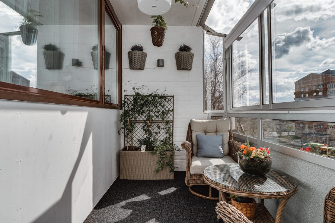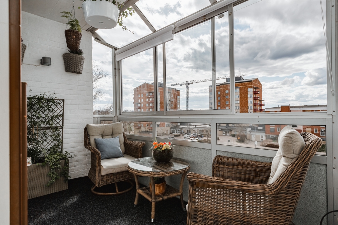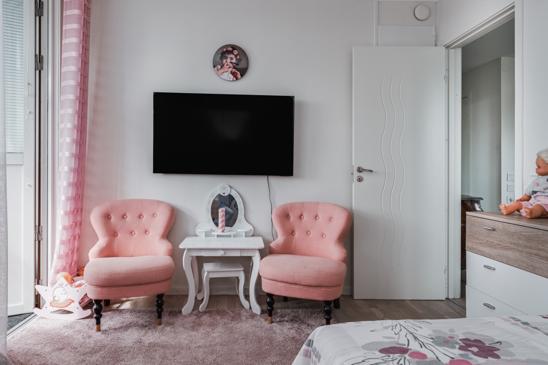 Här har man ett stort allrum med gott om plats för det stora sällskapet. Stora fönsterpartier med härligt ljusinsläpp. Vitmålade väggar. Vitlaserad parkettgolv. Spotlights.