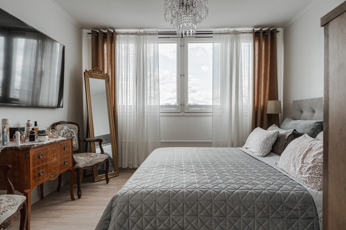Stilrent kök. Renoverat 2021. Här erbjuds generösa bänkytor och förvaringsskåp. Vitvaror bestående av hel frys/frys(rostfritt), spishäll, ugn, fläkt och diskmaskin. Vita väggar. Vitlaserad parkettgolv.