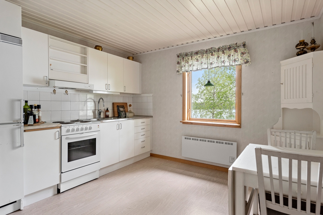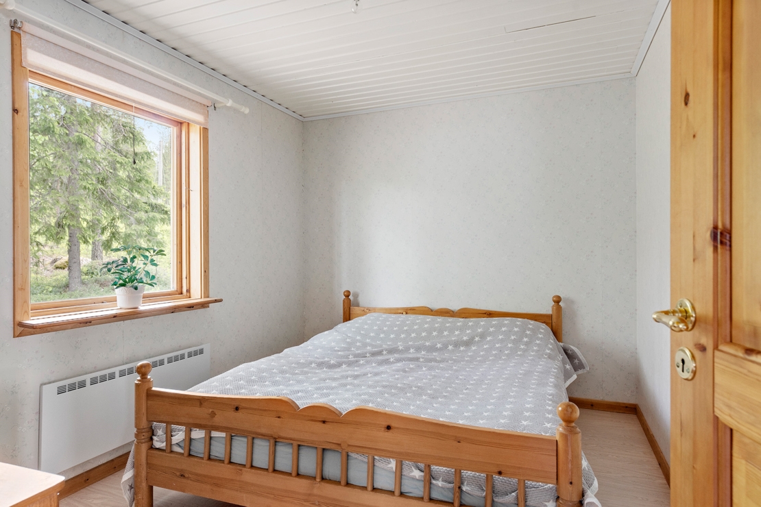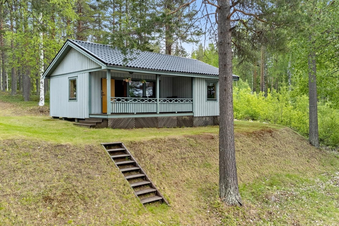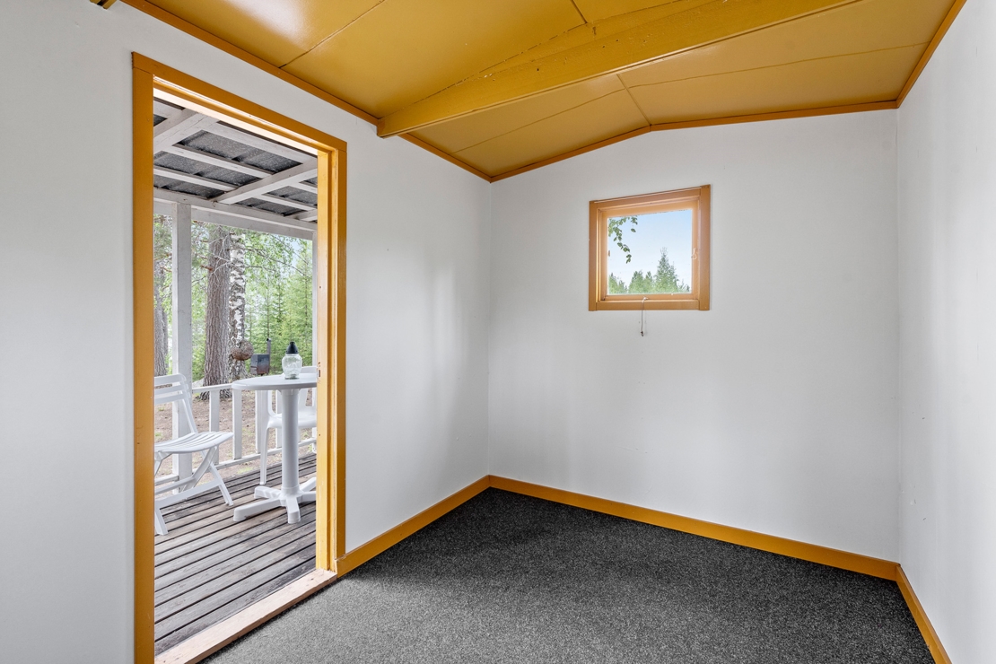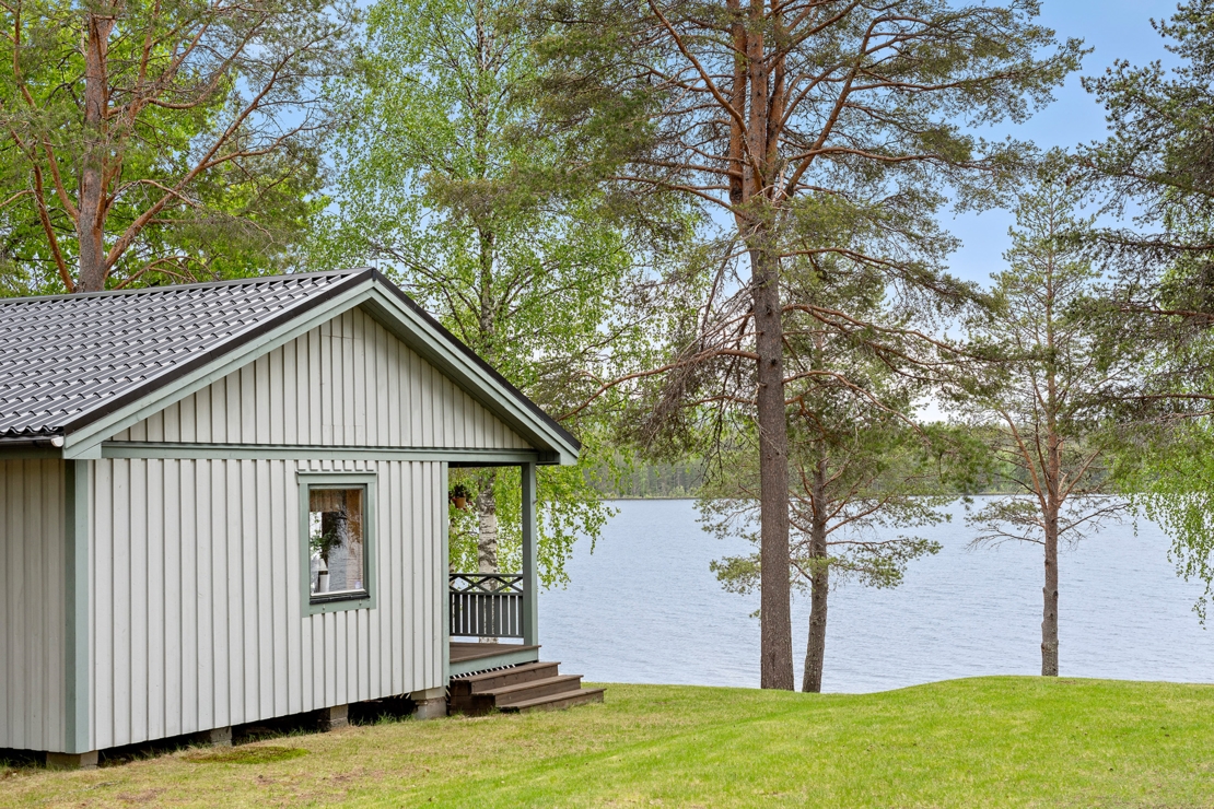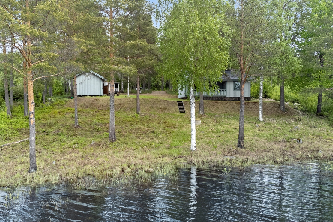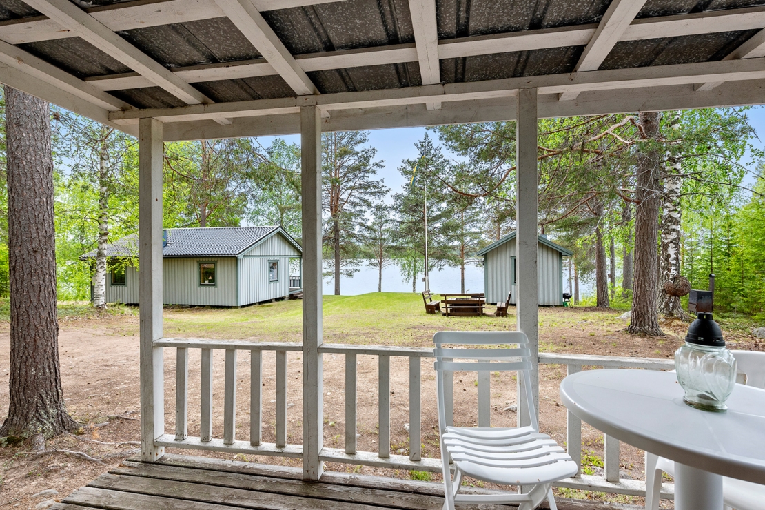 Stugan består av ett allrum med öppen spis, sovrum, kök och toalett. Från altanen som ligger under hustaket har man en fascinerande utsikt över sjön.