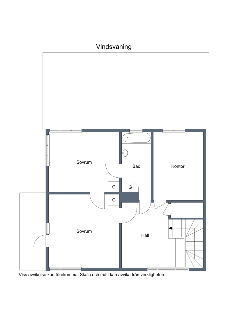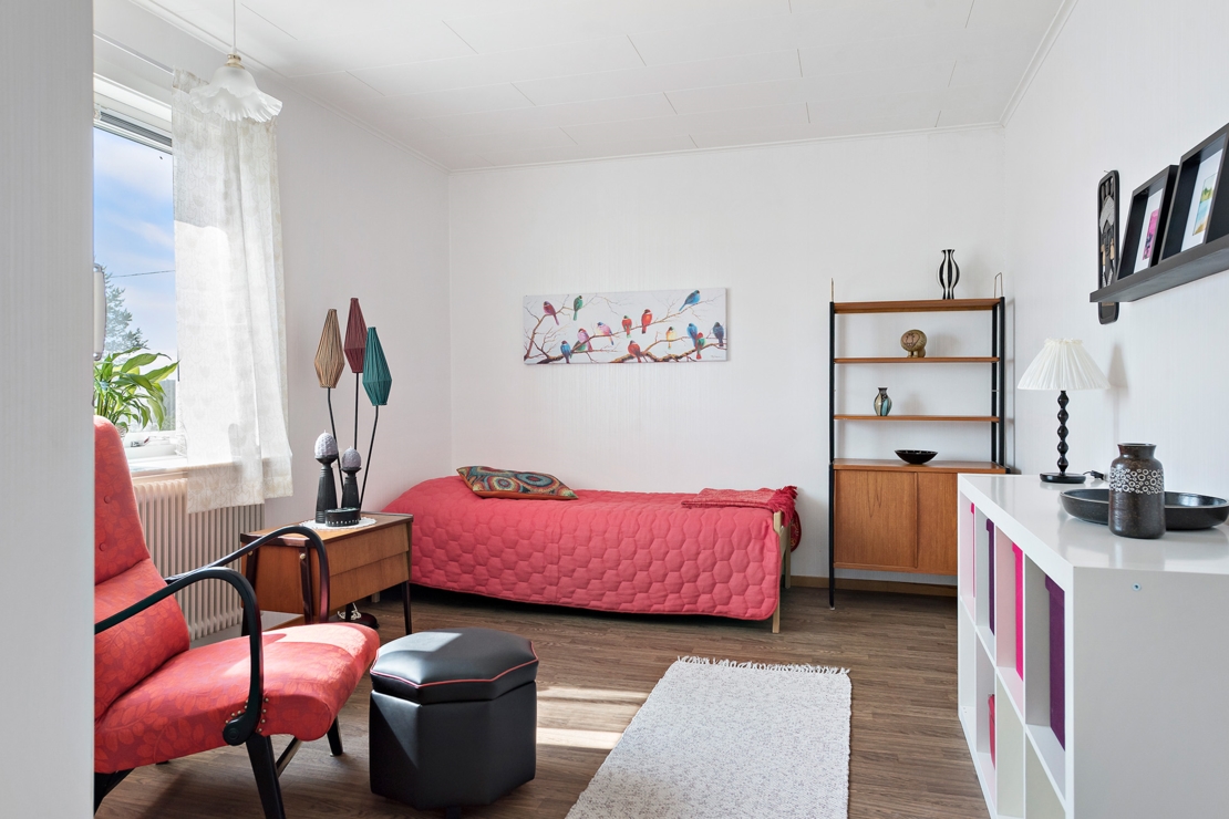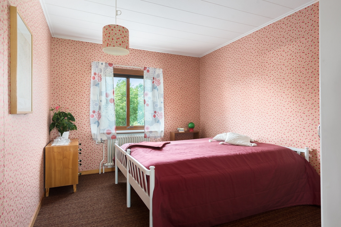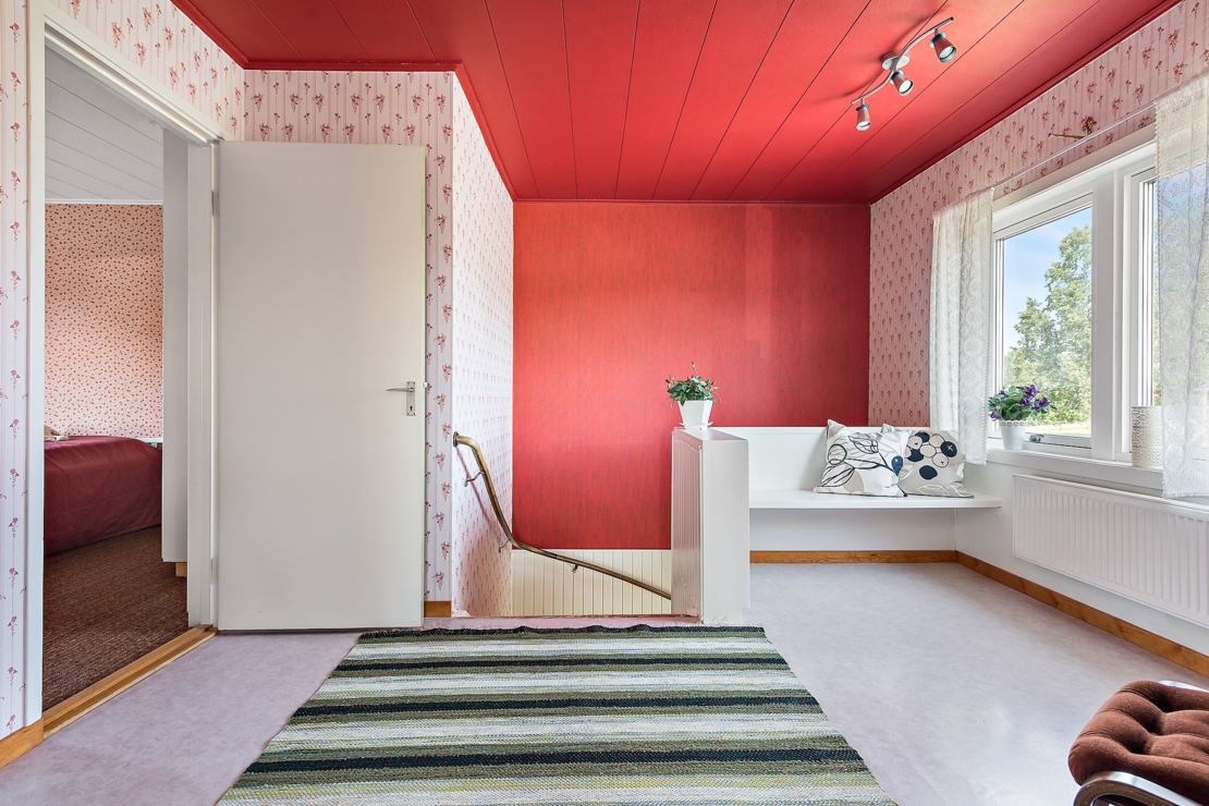 På övre plan finns tre sovrum med garderober, badrum med toalett och dusch, hall och balkong.