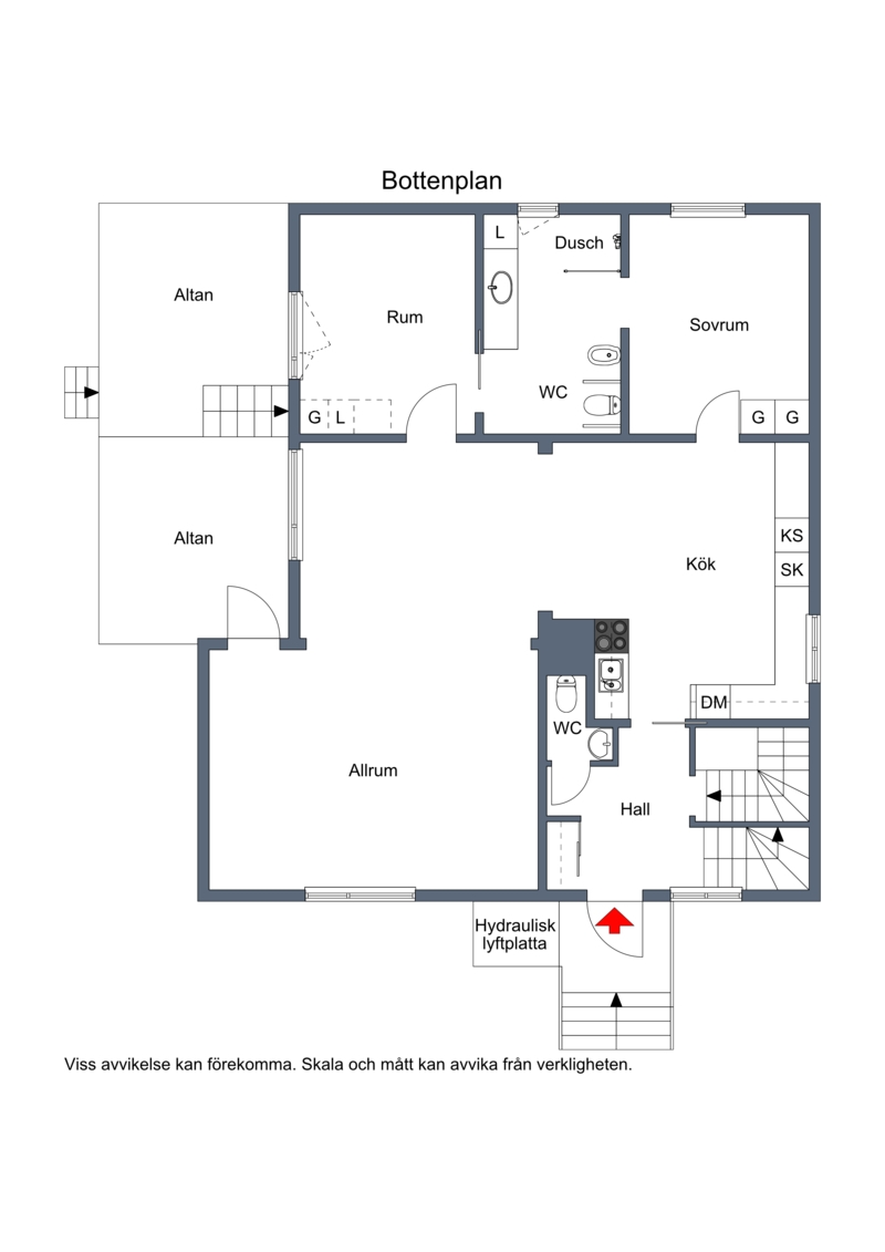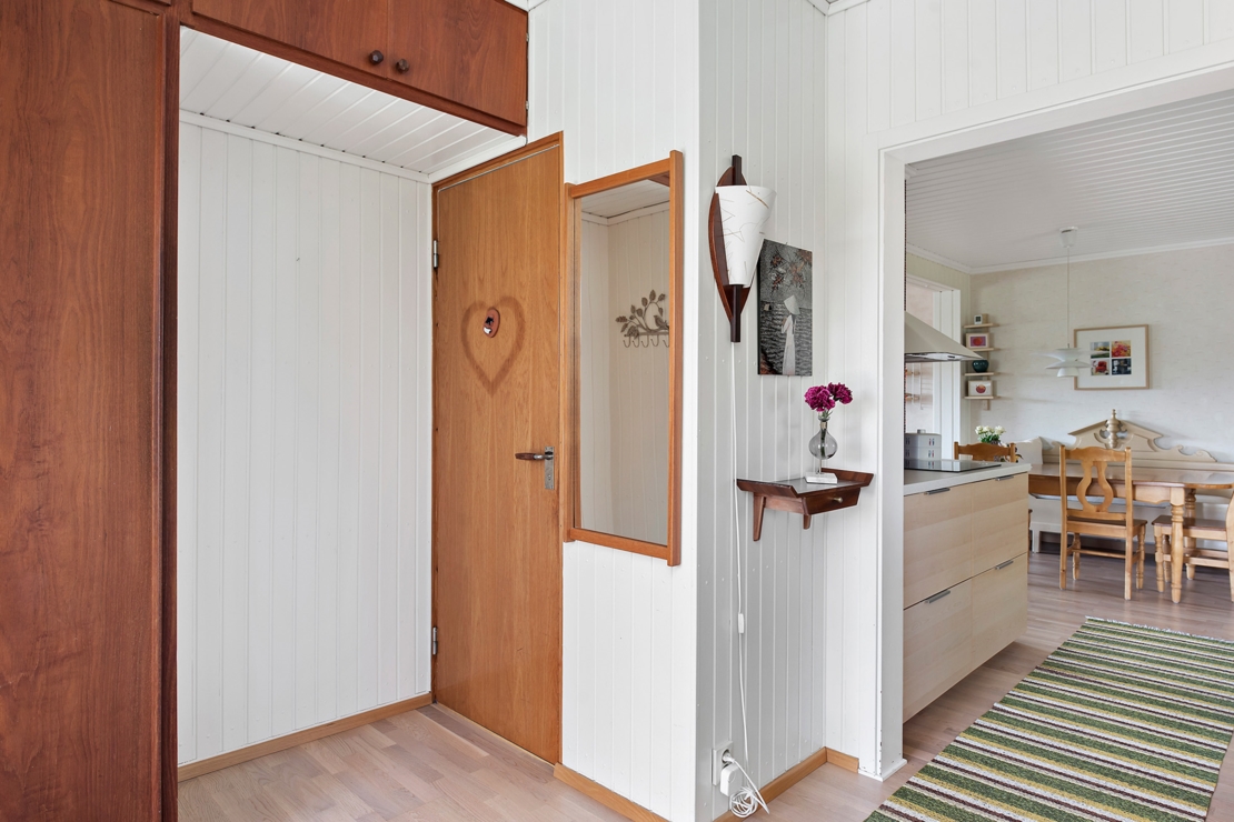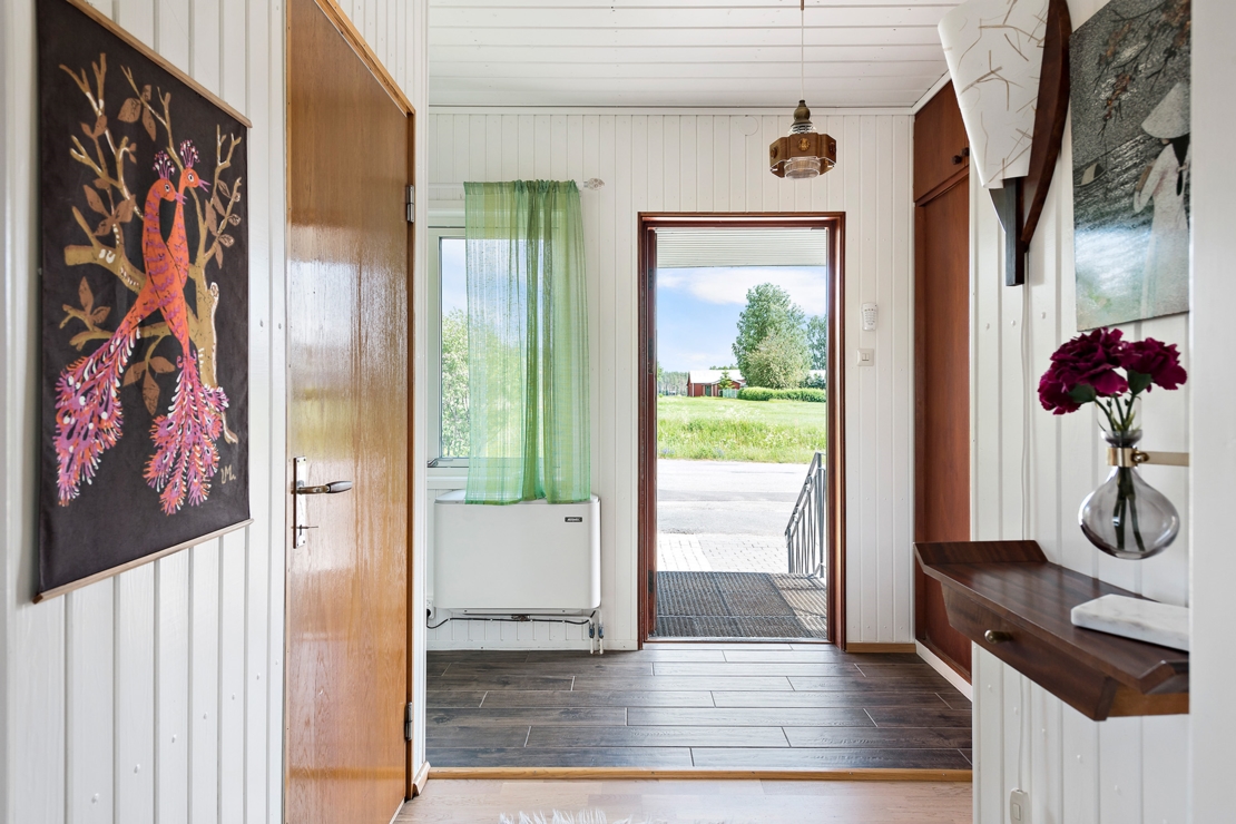 På entréplan finner man två sovrum, badrum med golvvärme som nås från det ena sovrummet och är utrustat med tvättmaskin och torktumlare, fräscht och fint kök med matplats, rymligt vardagsrum och gästtoalett. Den stora altanen i söderläge nås från vardagsrummet och har en fascinerande utsikt över Kalixälven.