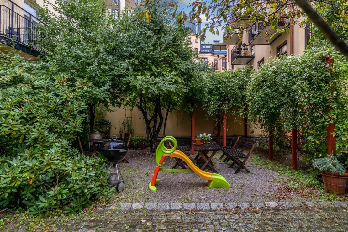 Innergård med lekstuga, cykelförråd finns liksom uppställningsplatser reserverade för barnvagnar.