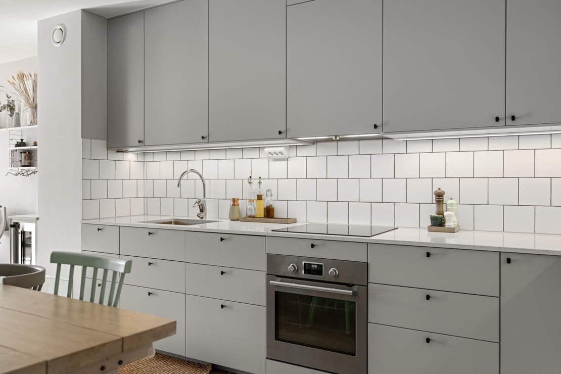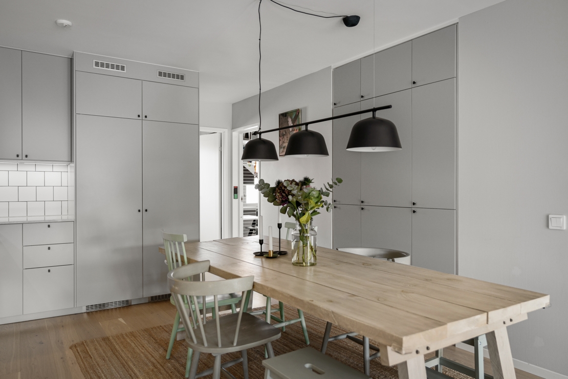 Intill vardagsrummet ligger det stilrena köket med härliga materialval och högklassiga vitvaror. Här finns gott om arbetsyta, platsbyggd skåpsförvaring och vinkyl. Släta skåpsluckor med ljusgrå ton, som samspelar med köksbänken i marmor. Här finns det plats för en stor matgrupp för 6-8 personer.
