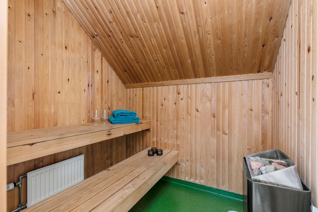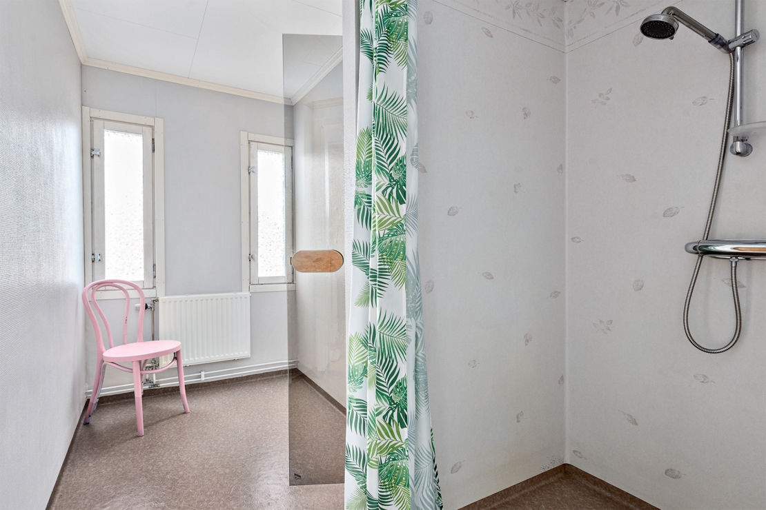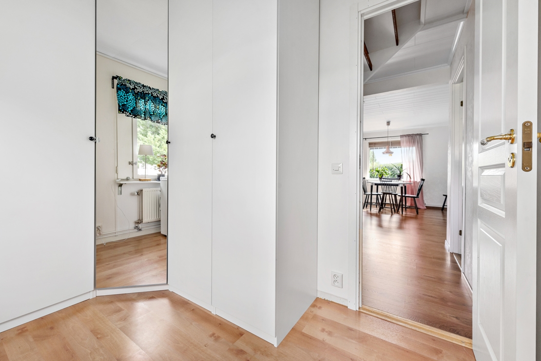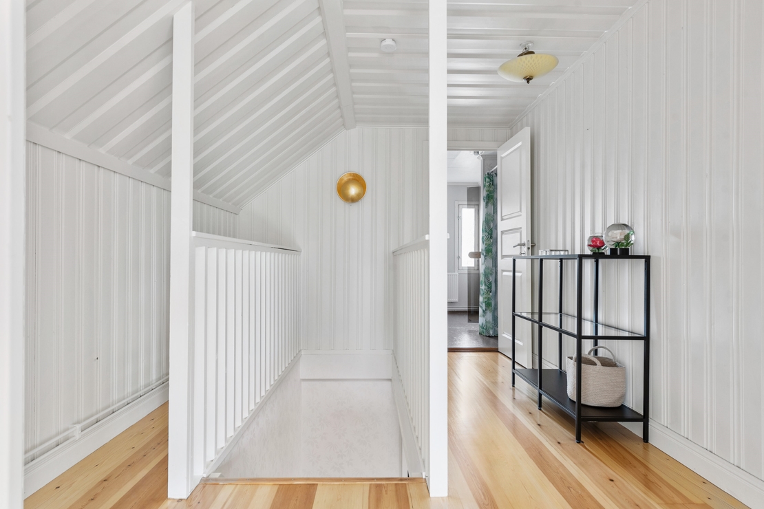 På övre plan ligger ett stort sovrum med trägolv, bastu, dusch och flera förvaringsutrymmen.