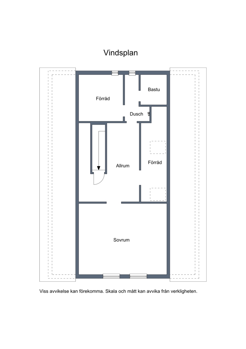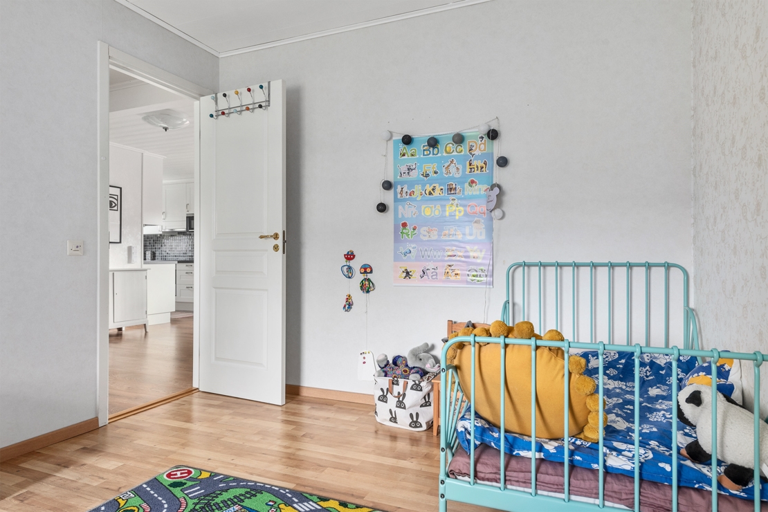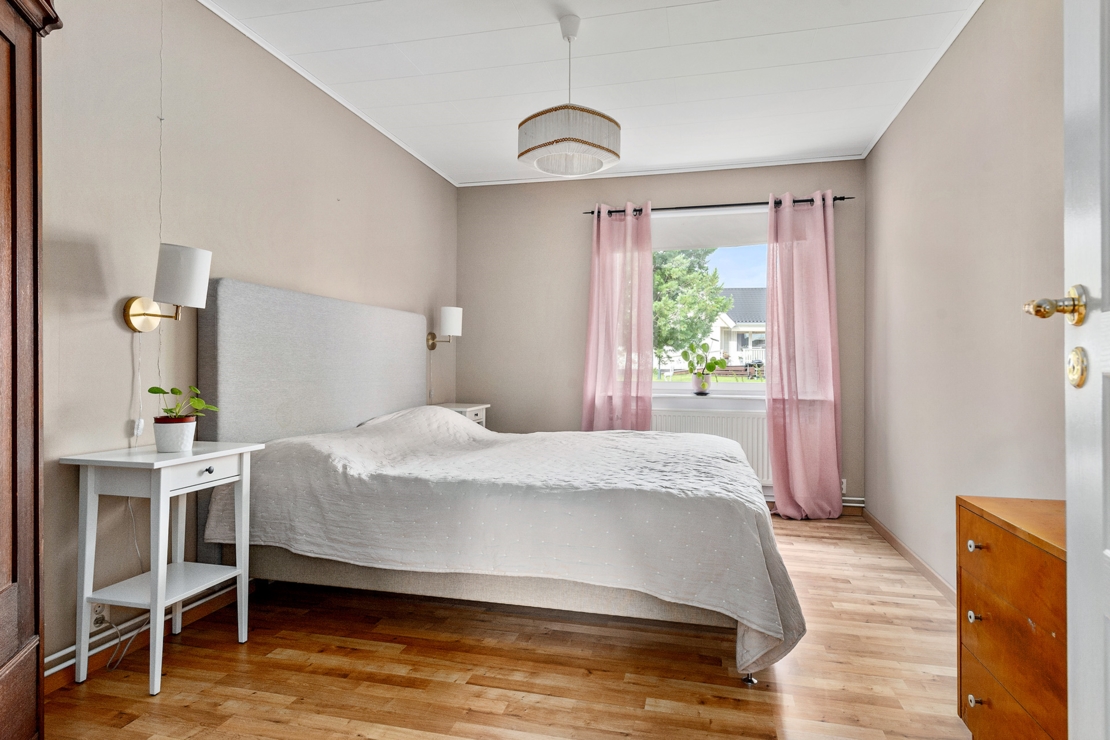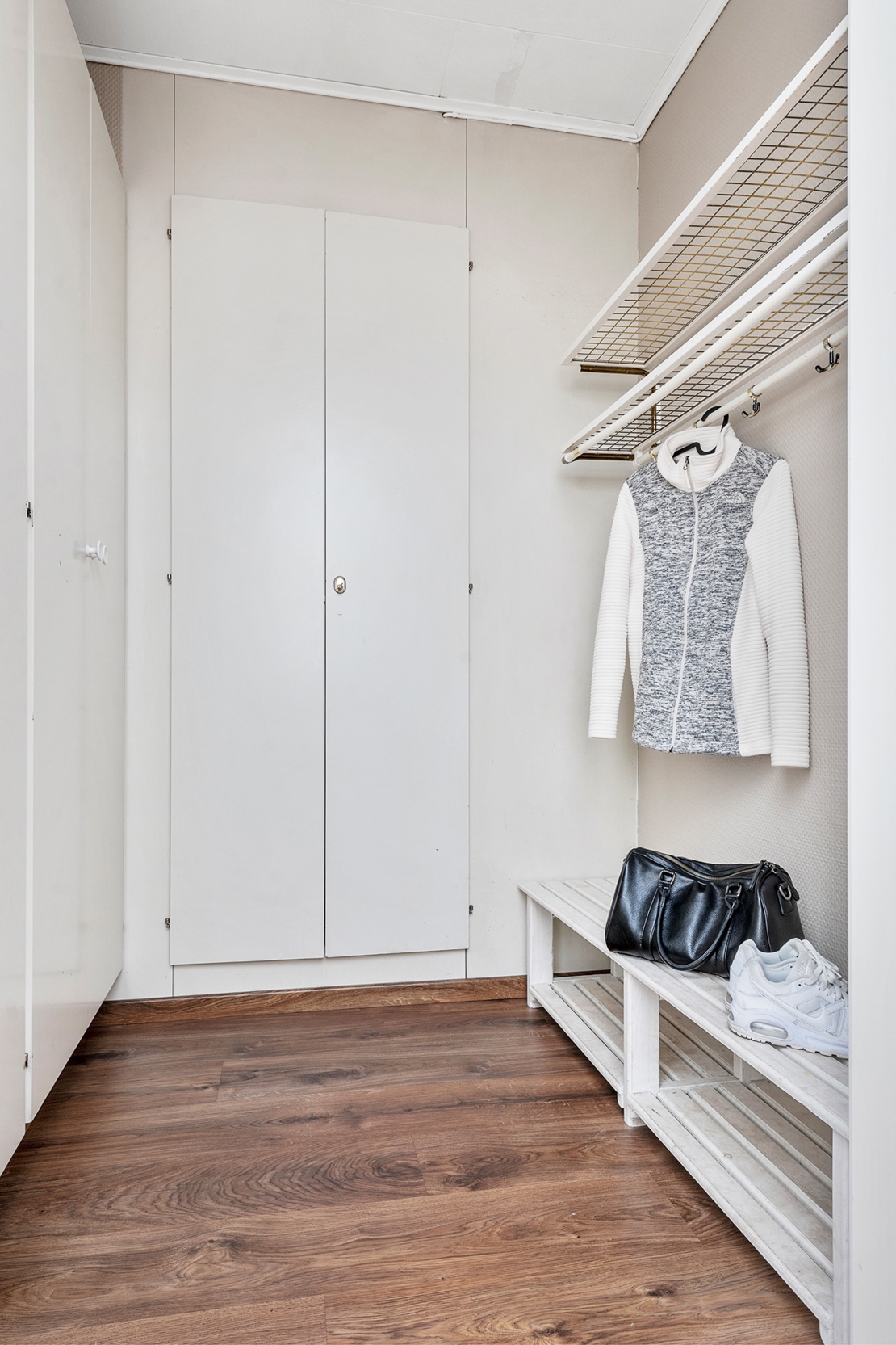 På övre plan ligger ett stort sovrum med trägolv, bastu, dusch och flera förvaringsutrymmen.