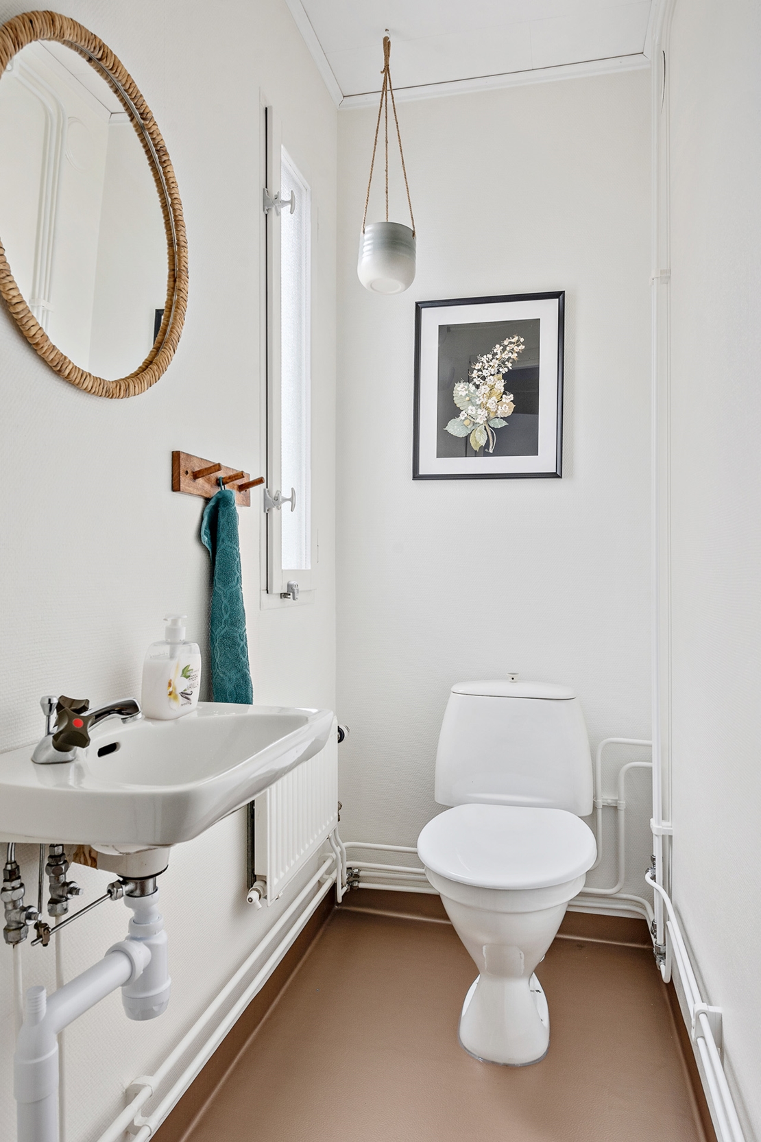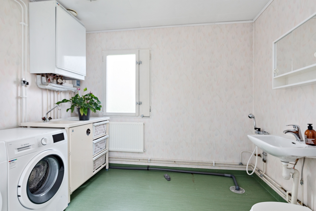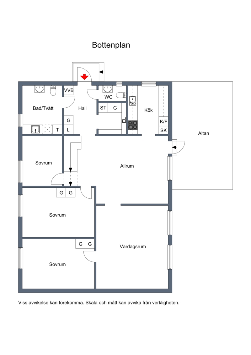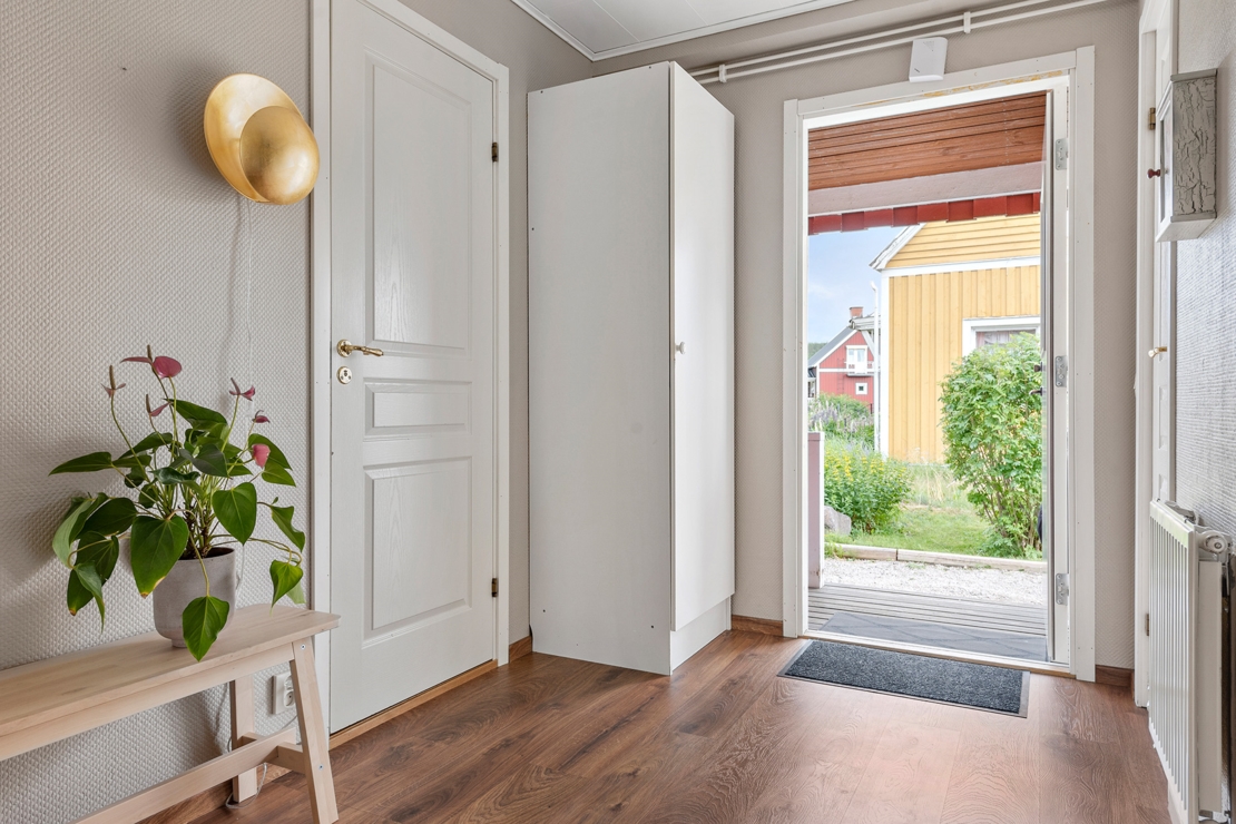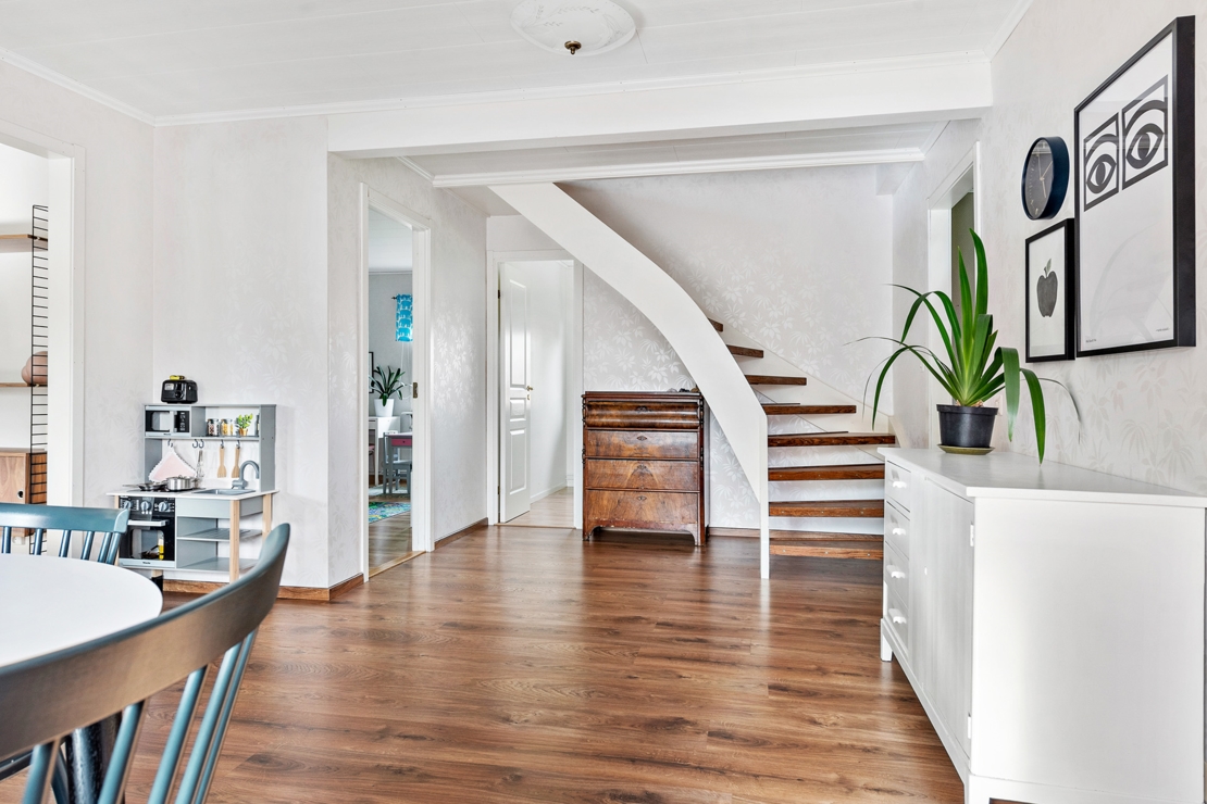 På entréplan finner man ett kök från 2010, ett rymligt allrum med utgång till altan i sydväst läge, hall med klädkammare, 3 sovrum med laminatgolv, ett ljust vardagsrum med parkett, en gästtoalett och en tvättstuga med toalett, ny torktumlare och tvättmaskin och även plats för dusch/badkar.