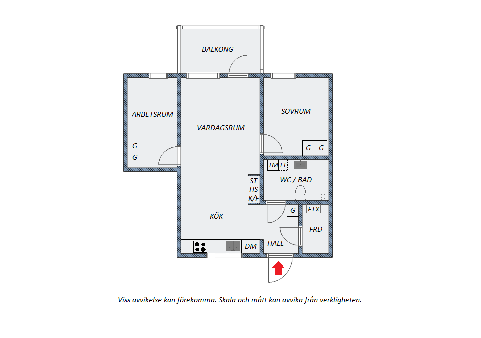 Från entrén i hallen når vi ett förråd med möjlighet att användas som klädkammare och hålla hallen blir fri från stök. Från hallen kommer vi även till det rymliga badrummet med dusch, toalett och tvättmaskin.