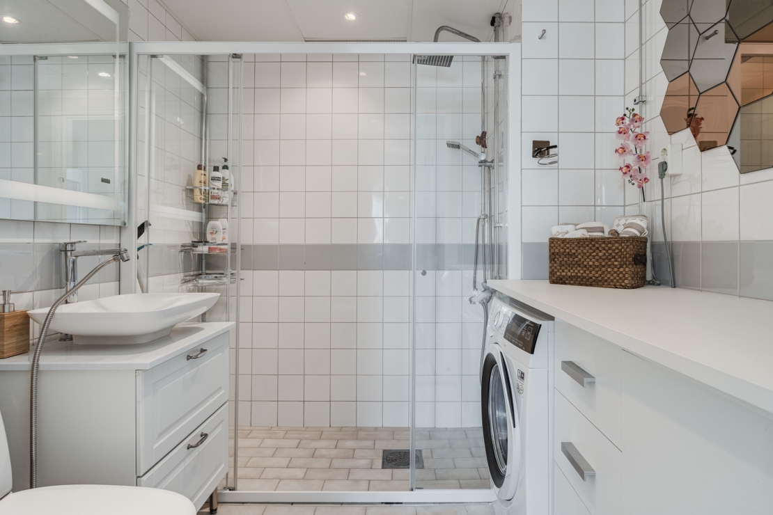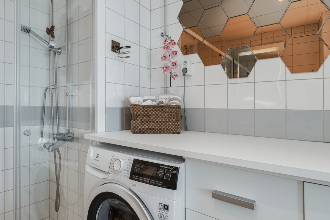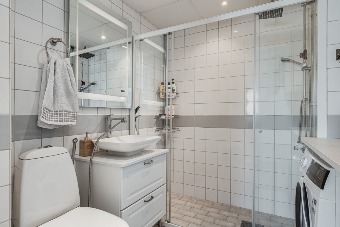 Stilrent helkaklat badrum. Badrummet är utrustat med WC, tvättställ, spegelskåp, dusch samt tvättmaskin som förenklar vardagsbestyren.