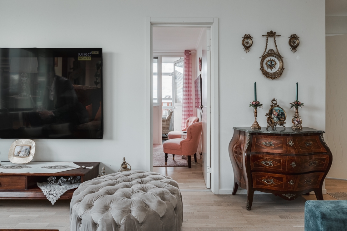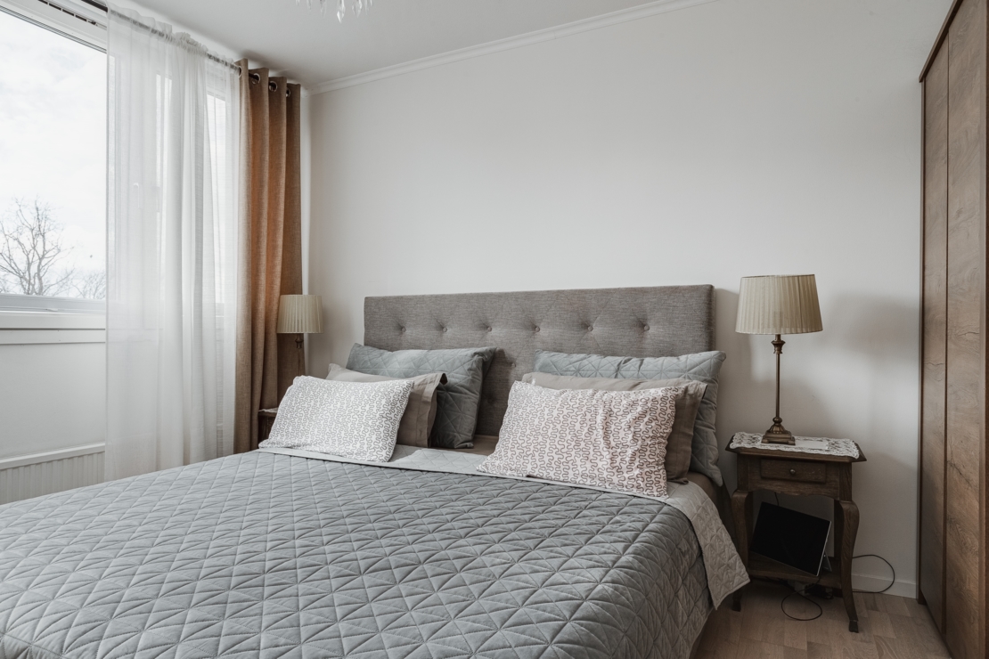 Stilrent kök. Renoverat 2021. Här erbjuds generösa bänkytor och förvaringsskåp. Vitvaror bestående av hel frys/frys(rostfritt), spishäll, ugn, fläkt och diskmaskin. Vita väggar. Vitlaserad parkettgolv.