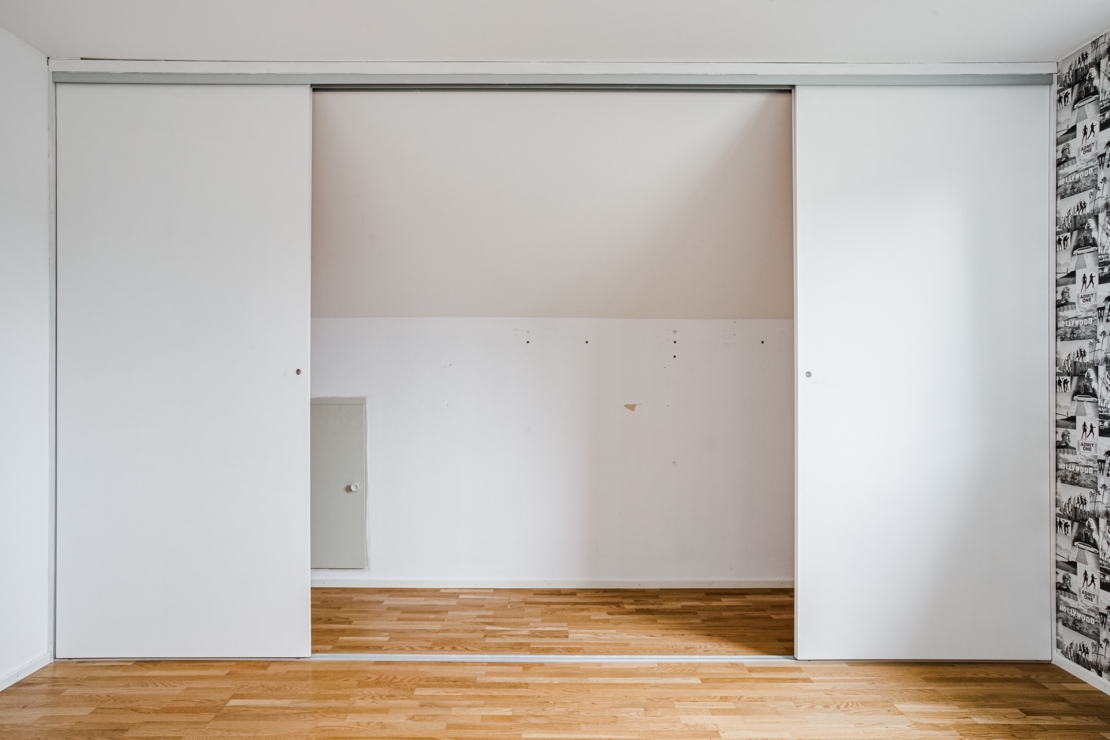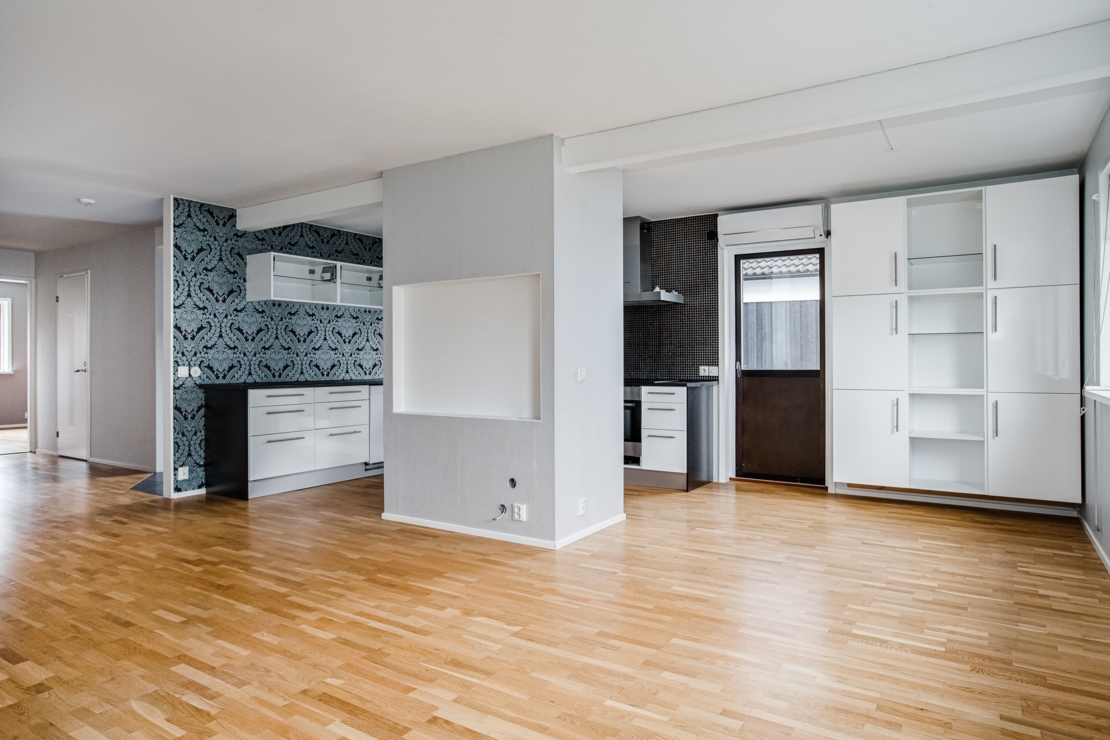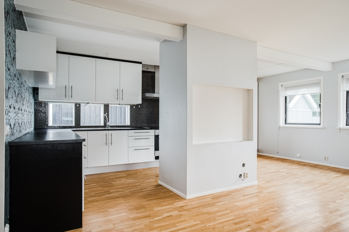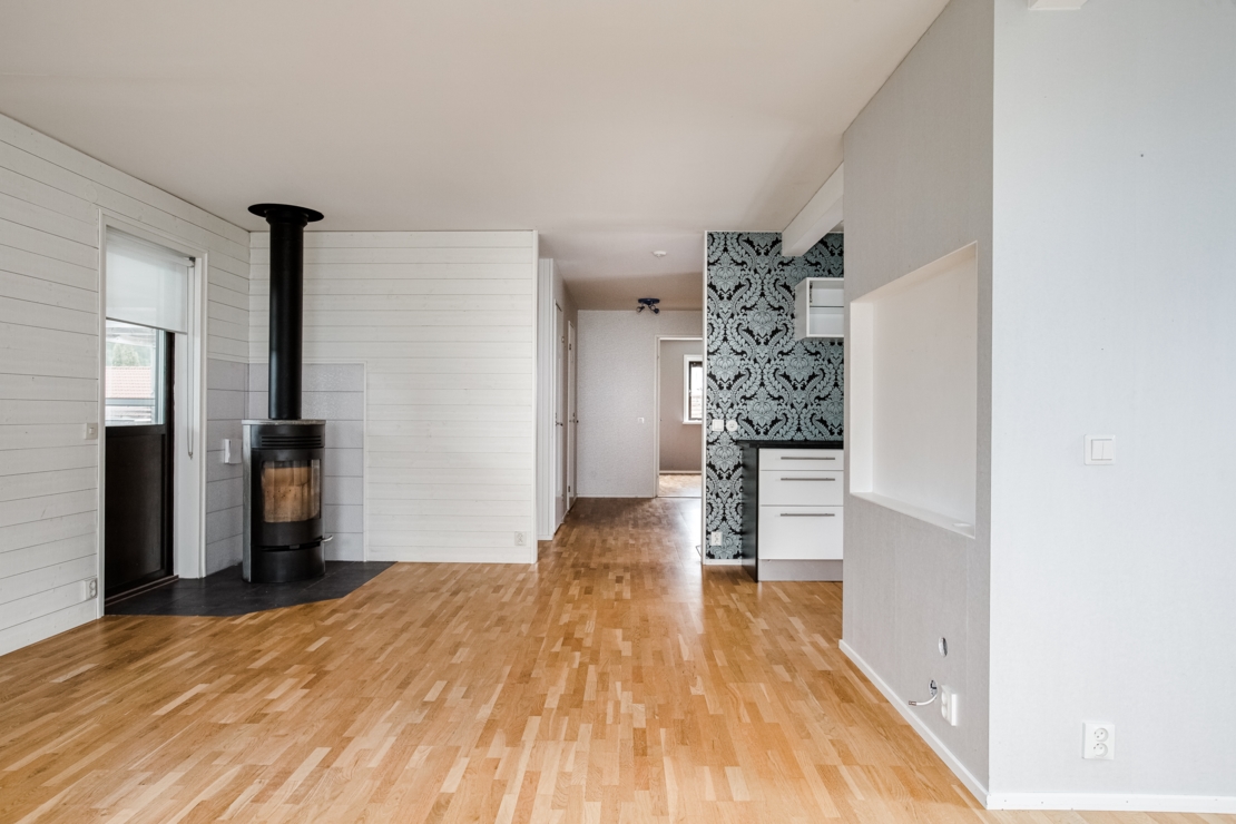 renoverades. Vägg mellan kök och vardagsrum revs och växlades av med balk.