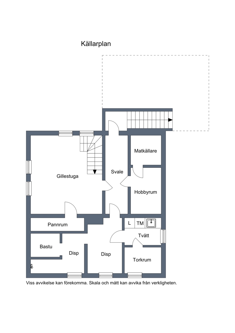 I källaren finns gillestuga, hobbyrum, tvättstuga, pannrum och matkällare. Dessutom en bastu med dusch och 750l stor varmvattenberedare.