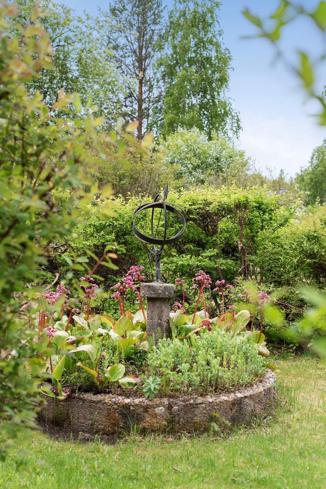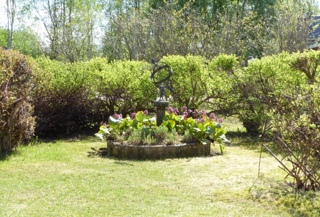 Välvårdad trädgård med bärbuskar, odlingsland och olika sorters träd.