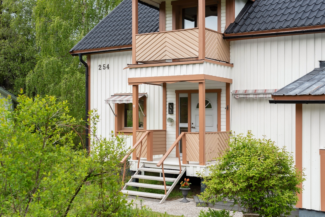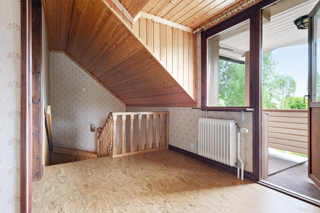 På övre planet finns det ett större och två mindre sovrum, toalett, smarta förvaringsmöjligheter och en trevlig balkong med utsikt över trädgården.