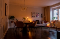 Väl tilltaget vardagsrum med plats för soffgrupp och matplats för det stora sällskapet. Här finns även en praktisk klädkammare med bra förvaring.