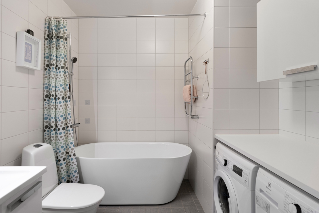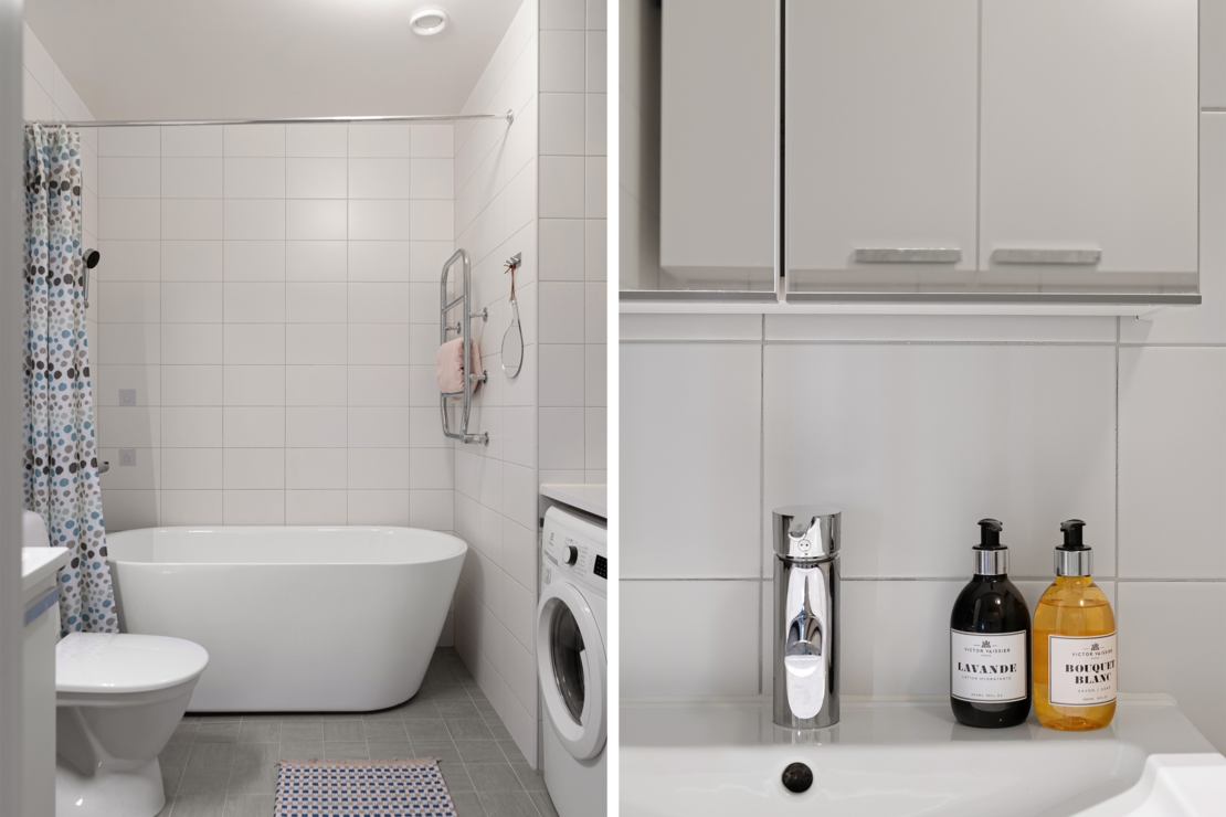 Helkaklat med vita väggar och gråa golv. Dusch, spegel med handfat och kommod, golvvärme, samt egen tvätt- och torkmaskin.