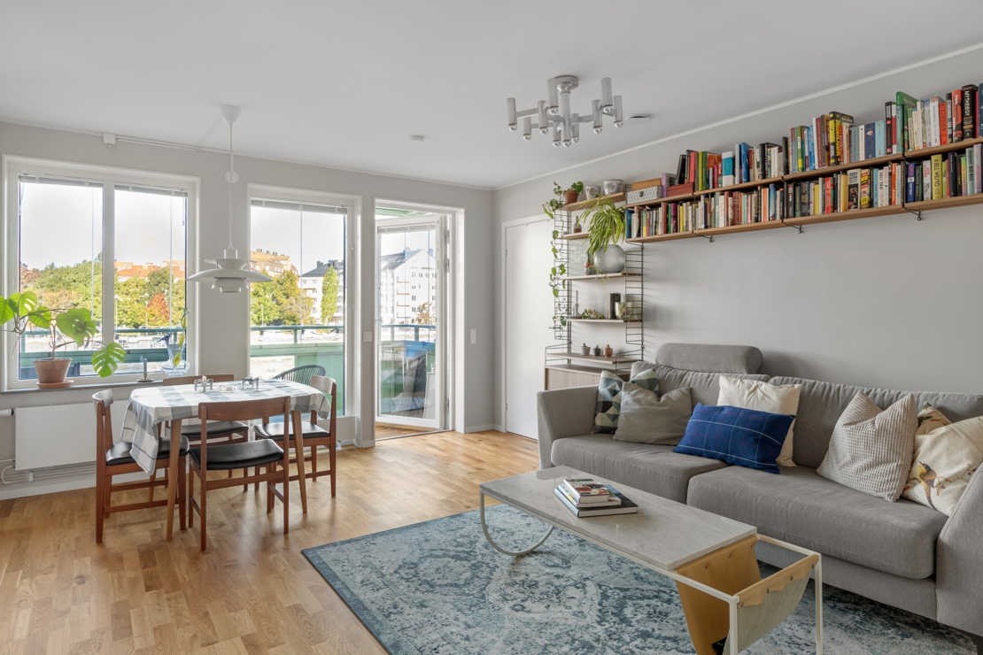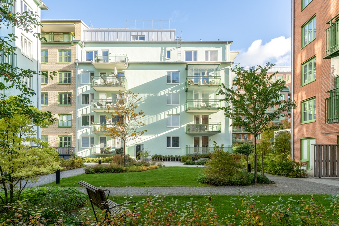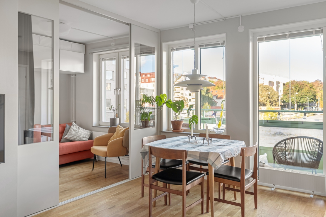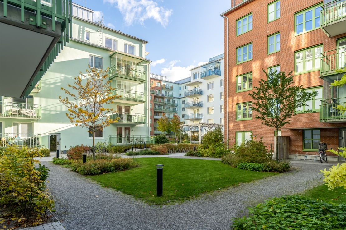 Bäst av allt; stor balkong i fritt läge mot väst med inglasning och användning året om, samt en härlig uteplats mot lugn innergård. Här sitter man ostört på sommarmorgnar och njuter av frukosten och morgonkaffet! På balkongen åtnjuter du middag i kvällssolen eller en midnatts supé. Interiören blir tack vare sitt fina läge med stora fönster och vita väggar, väldigt ljus. Inte minst i kök/vardagsrum som samspelar i en trevlig öppen planlösning. Här finns stora ytor där soffa och matbord har sin naturliga plats. Belysningen i hela bostaden kan styras från enhet uppkopplad till Wi-Fi. Vidare finns här massor av förvaring i både klädkammare och garderober. Rymligt stilsäkert badrum med helkaklade ytskikt, golvvärme samt tvättmaskin och torktumlare. Utmärkt sovrum med möjlighet för arbetsplats, samt utgång till den stora uteplatsen. Köket är utrustat med allt man kan önska i förvaringsväg och komplett maskinell utrustning. Den stora balkongen som nås från vardagsrummet blir som ett extra uterum och kan nyttjas åtet runt. Lägenheten har genomgående ekparkett, ljusa målade väggar och stora fönster. Här finns allt man kan önska sig i ett boende och lite till! Du som behöver ett sovrum till, kan tack vare fönstrens placering bygga ett rum där nuvarande ägare har matplats, se alternativ planlösning.