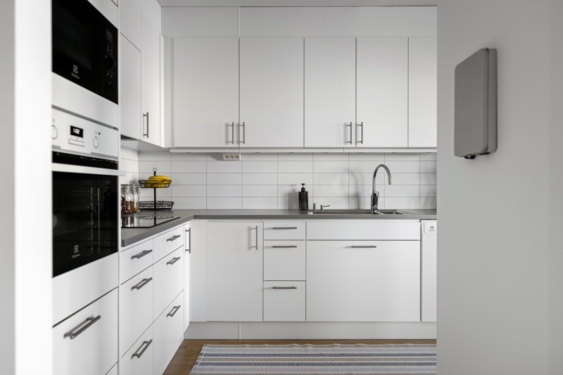 Modernt kök med vita luckor och grå bänkskiva. Köket är fullutrustat med högkvalitativa vitvaror från Elektrolux, bla. inbyggda diskmasking, ugn, mikro, samt induktionshäll och full stora kyl och frys. Gott om förvaring och plats för matgrupp om 4-6 personer.