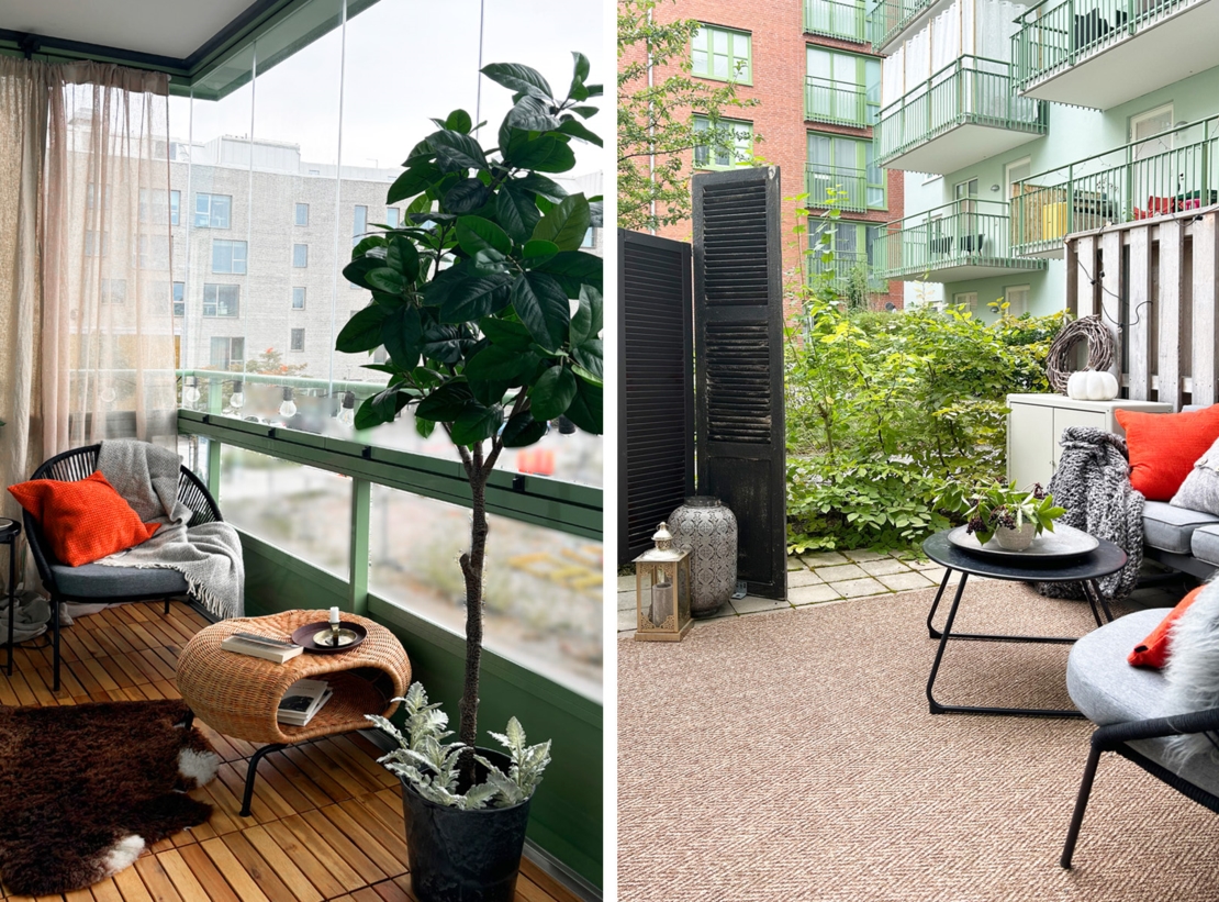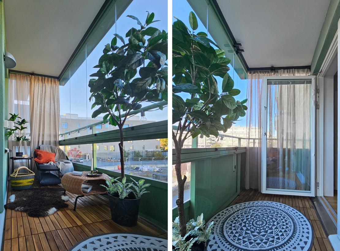 Stor och härlig inglasad balkong med sol på eftermiddag kväll som kan nyttjas året om.