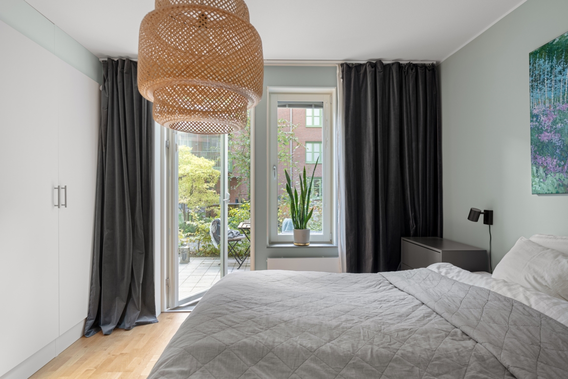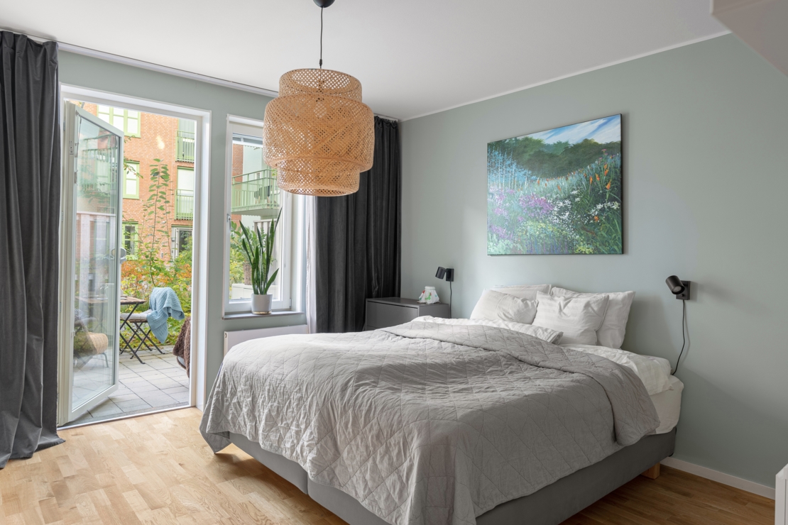 Stort sovrum med inbyggd förvaring, samt plats för dubbelsäng, samt skrivbord. Utgång till den härliga uteplatsen.