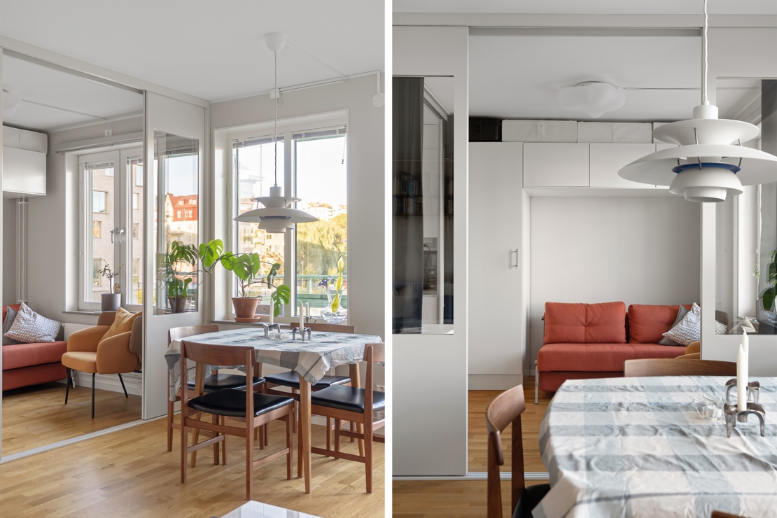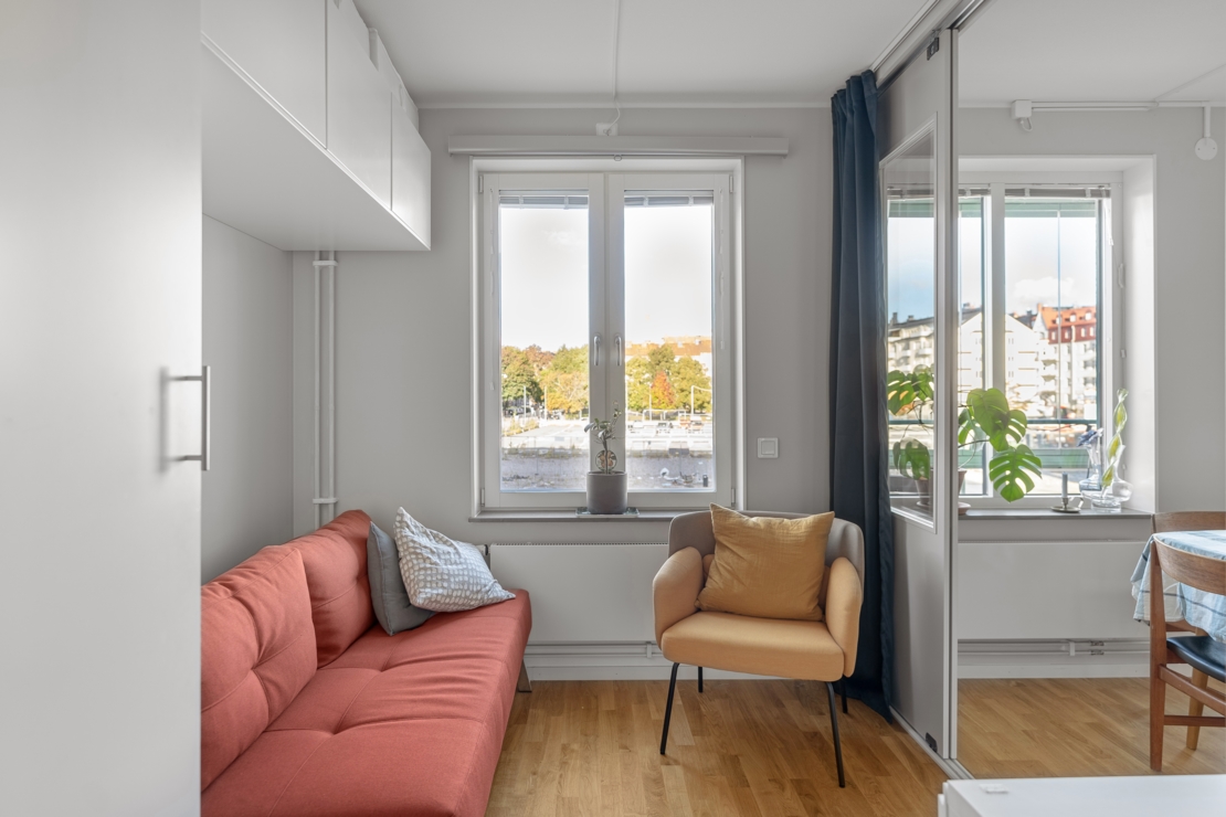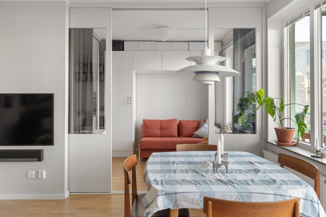 Stort luftigt och ljust med öppen planlösning, samt utgång till balkong. TV/Bredabandsuttag i alla innerväggar, samt plats för allehanda möblering.
