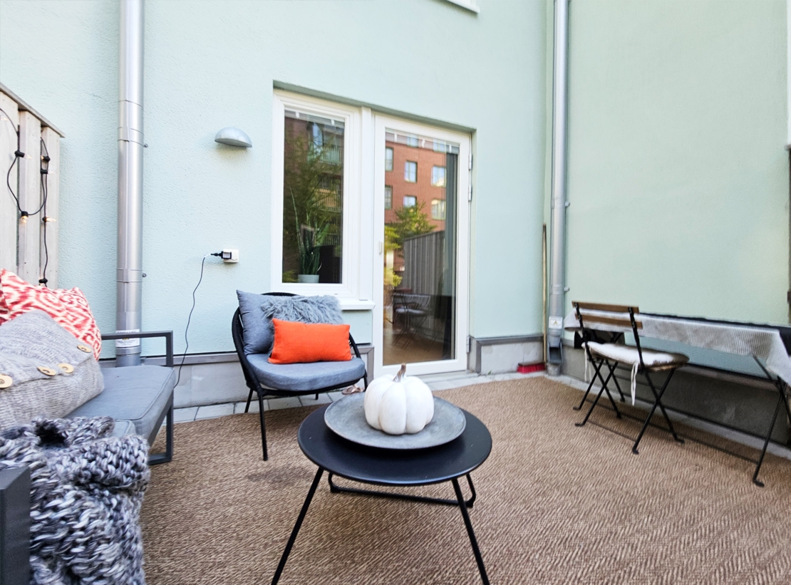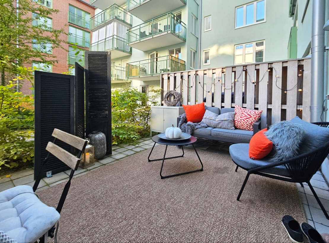 Stor uteplats om ca. 16 kvm med plats för utemöbler och grill. Uteplatsen ligger mot lugn innergård som ligger en våning upp från gatan och har gemensamma ytor för fest och lek.