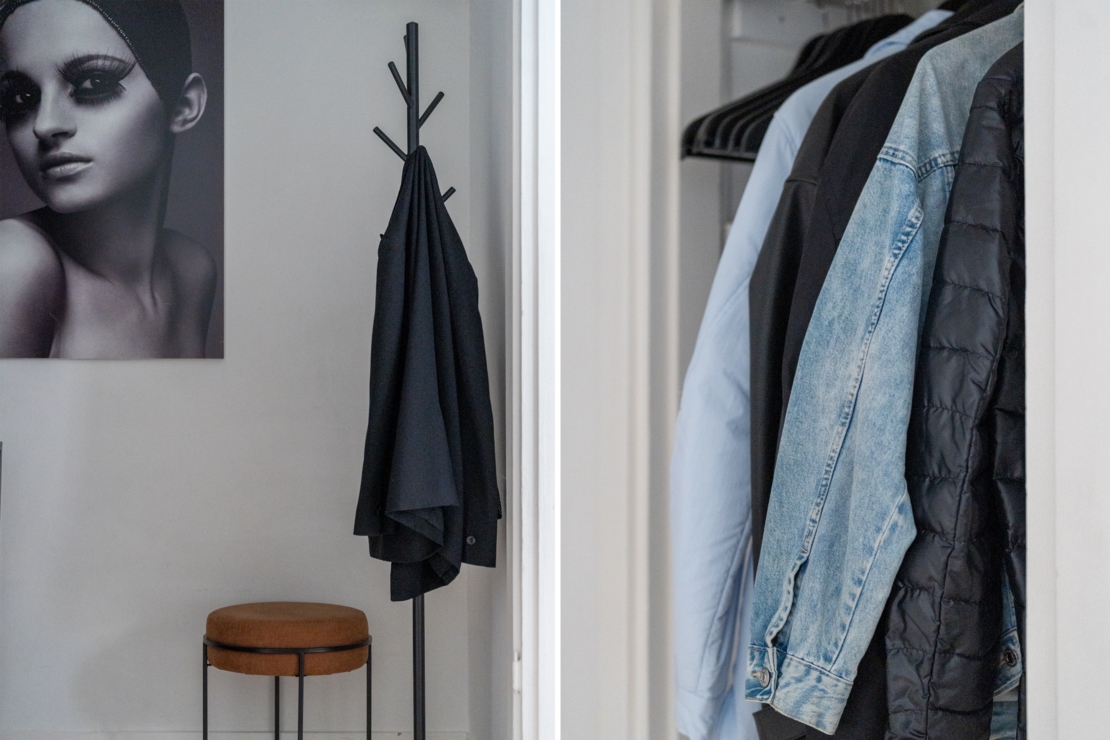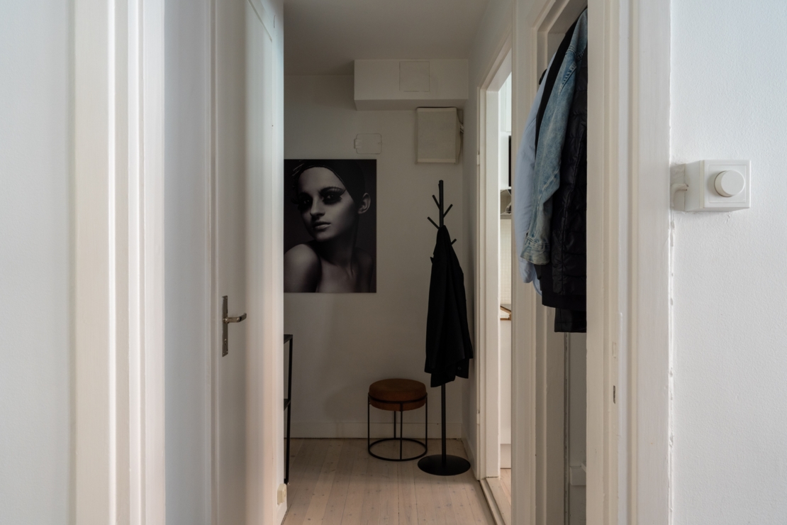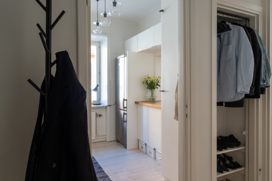 Välkomnande hall med trägolv och ljusa väggar. Plats för avhängning vid hatthylla samt förvaring i parktiskt garderober.