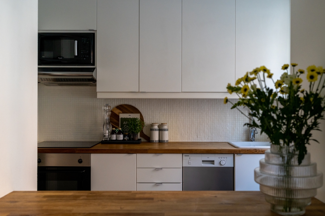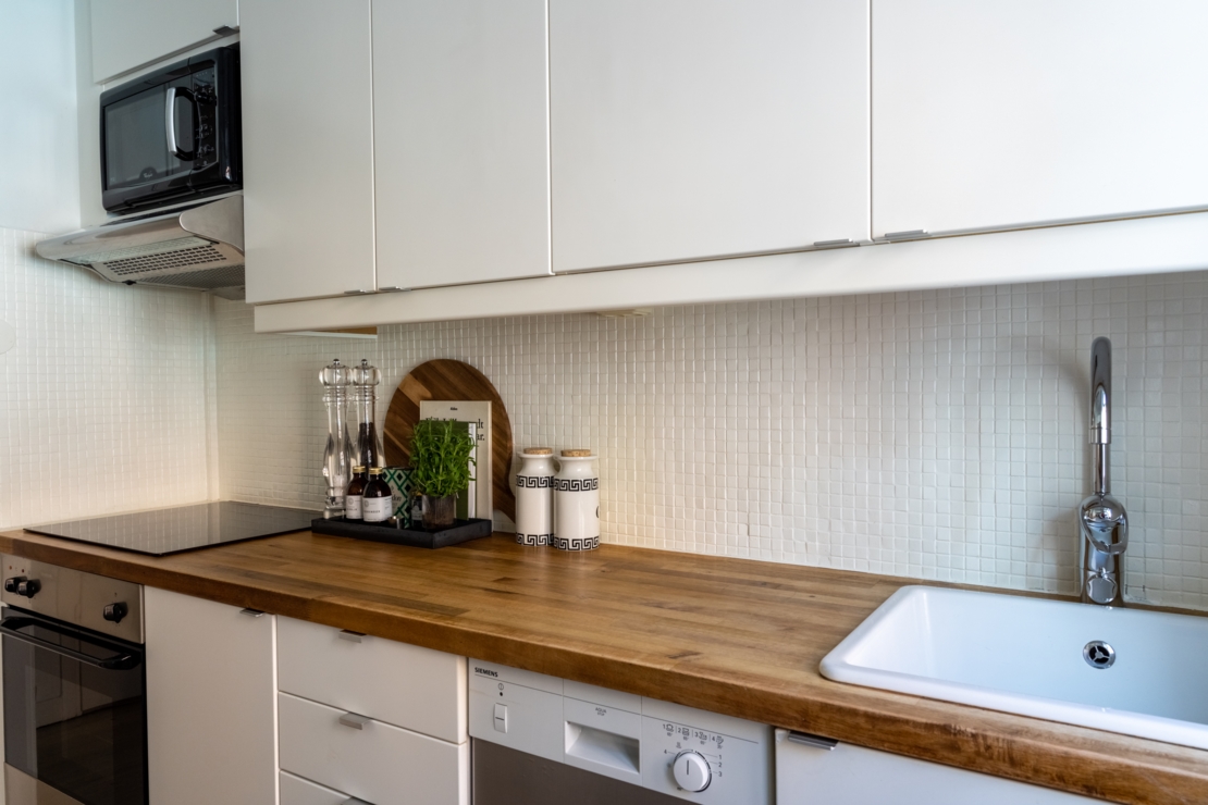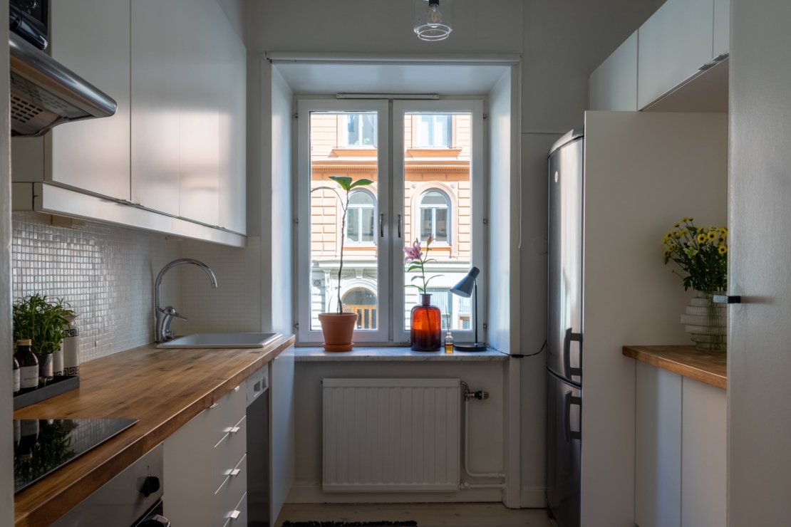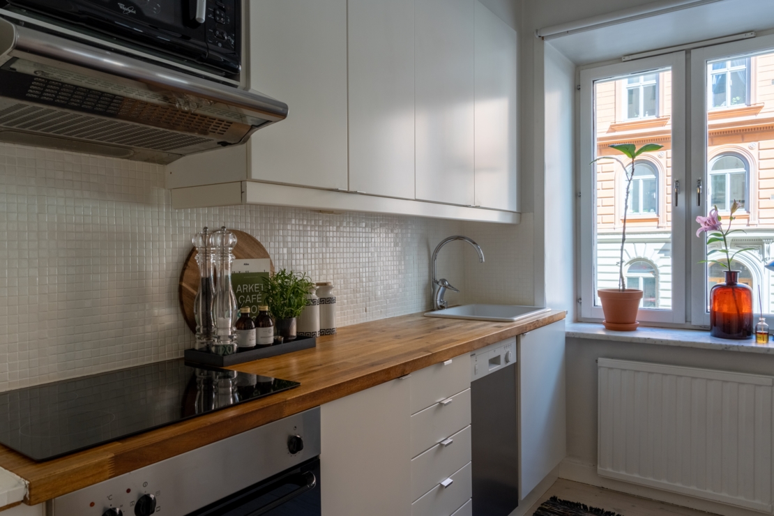 Stilrent kök med ljusa skåpluckor och kakel ovanför arbetsbänk i trä. Köket är maskinellt utrustat med spishäll, ugn, fläkt, mikro i arbetshöjd, diskmaskin samt kyl/frys.