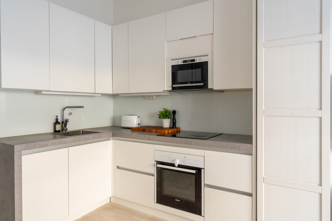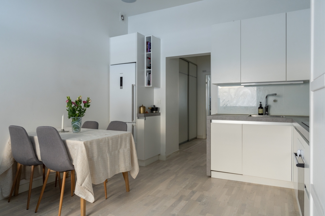 Stilrent kök med ljusa skåpluckor och stänkskydd i glas ovanför arbetsbänk. Köket är maskinellt utrustat med spishäll, ugn, fläkt, mikro i arbetshöjd, integrerad diskmaskin samt kyl/frys. Plats för matbord för sällskap om ca 4 personer.