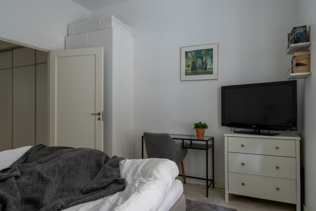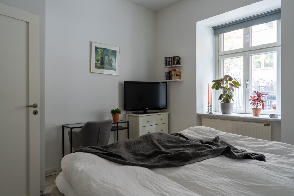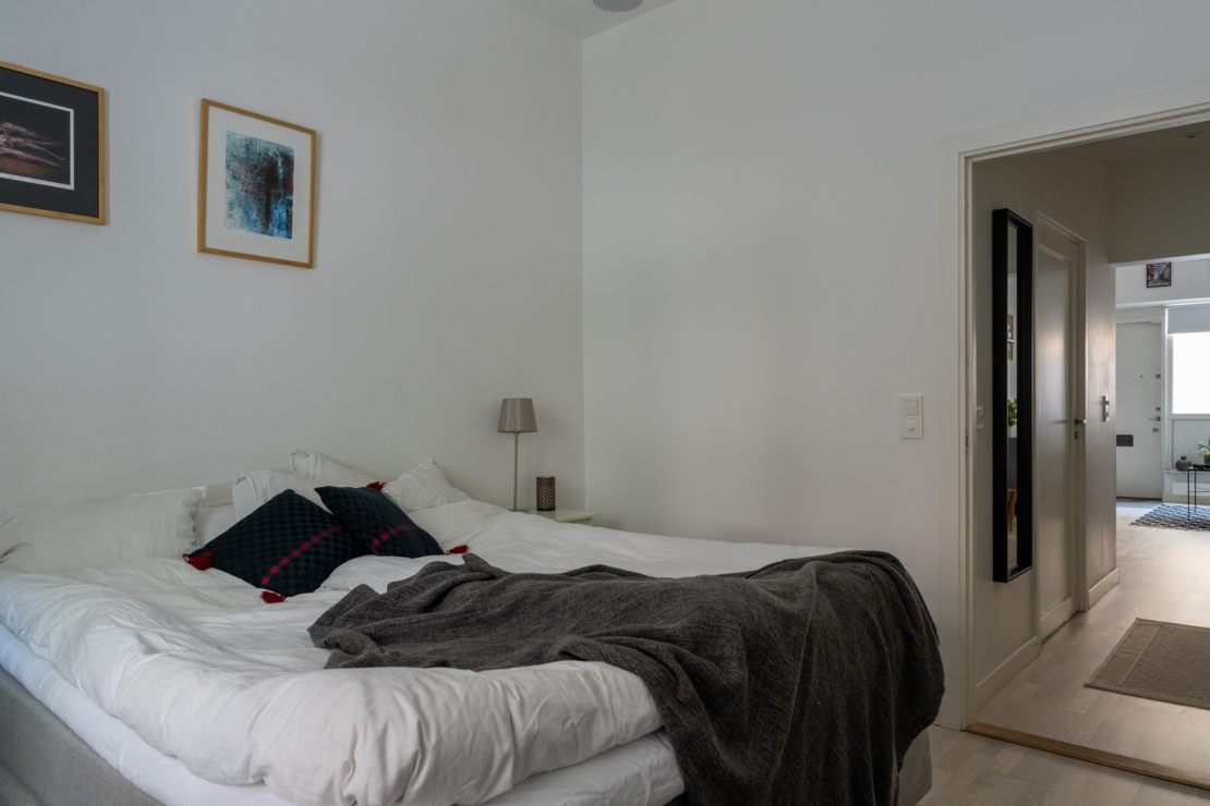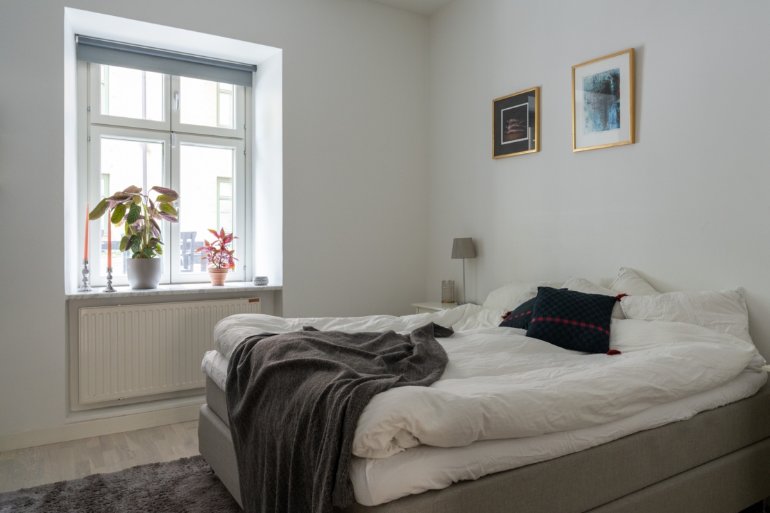 Rofyllt sovrum mot innergård med trägolv och ljusa väggar. Plats för dubbelsäng, nattduksbord och övrig förvaring.