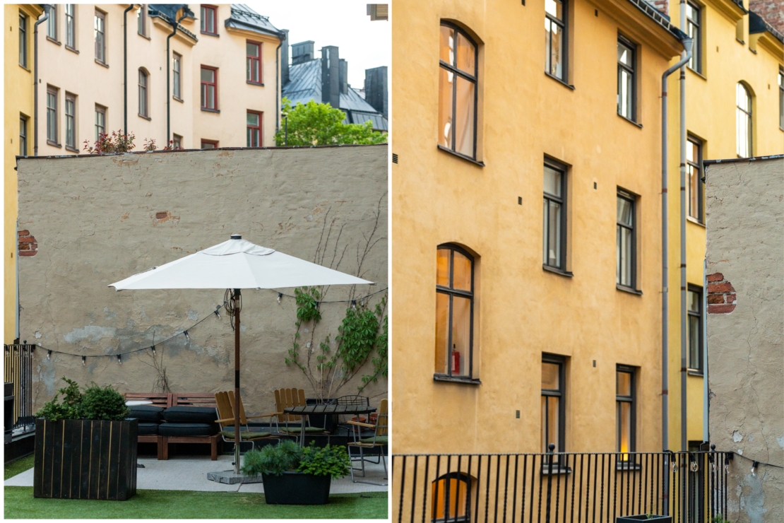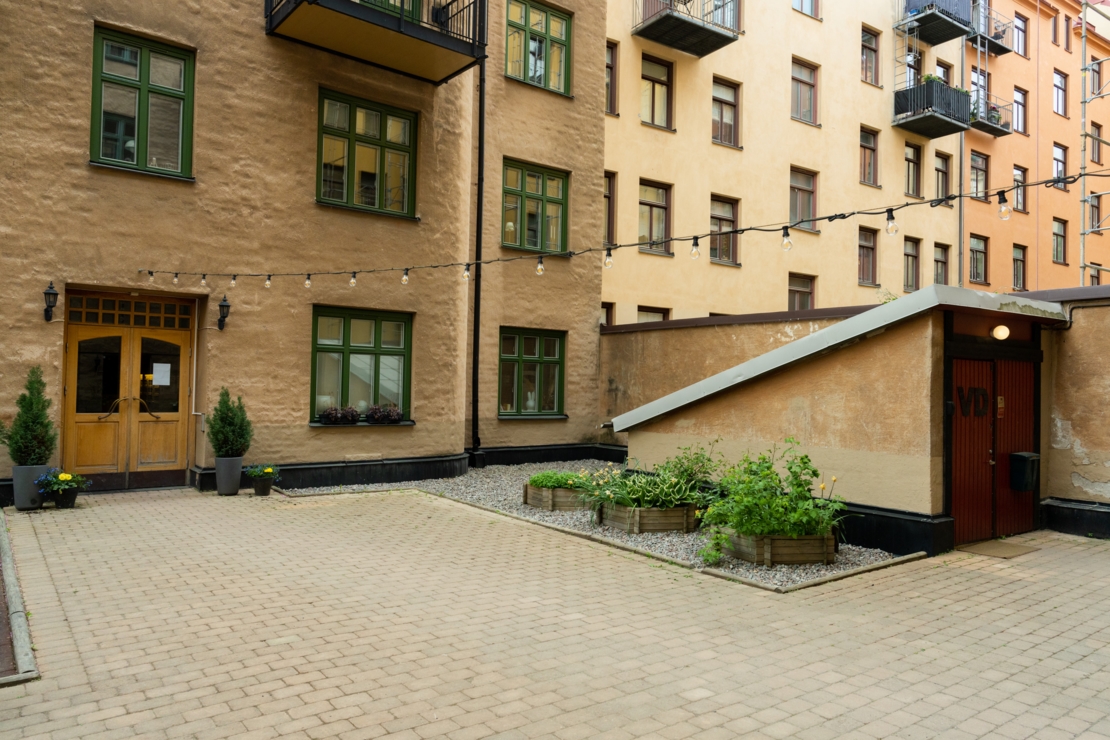 Föreningen har två trevliga innergårdar. En stor renoverad innergård med utemöbler, grillmöjligheter, lekytor och planteringar. Den mindre gården har utemöbler och grill.
