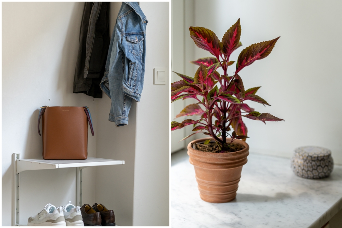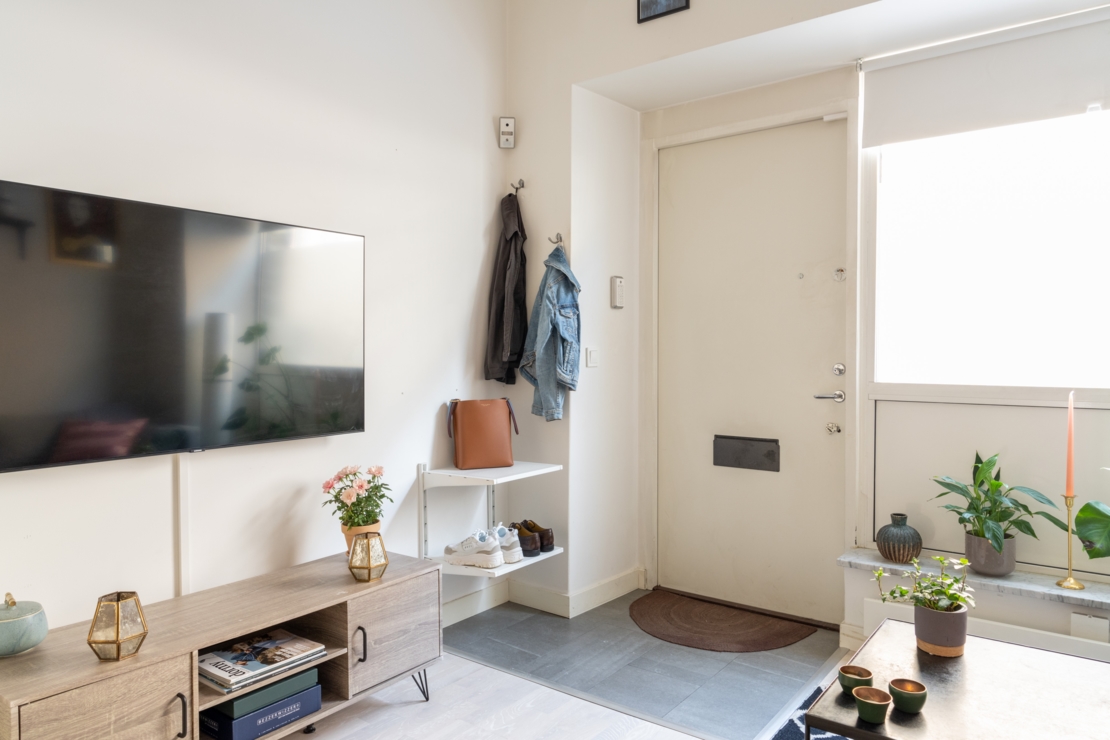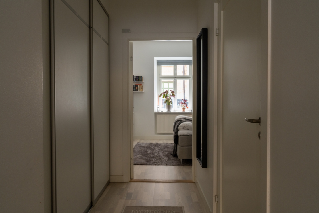 Välkomnande hall med klinker och ljusa väggar. Plats för avhängning.