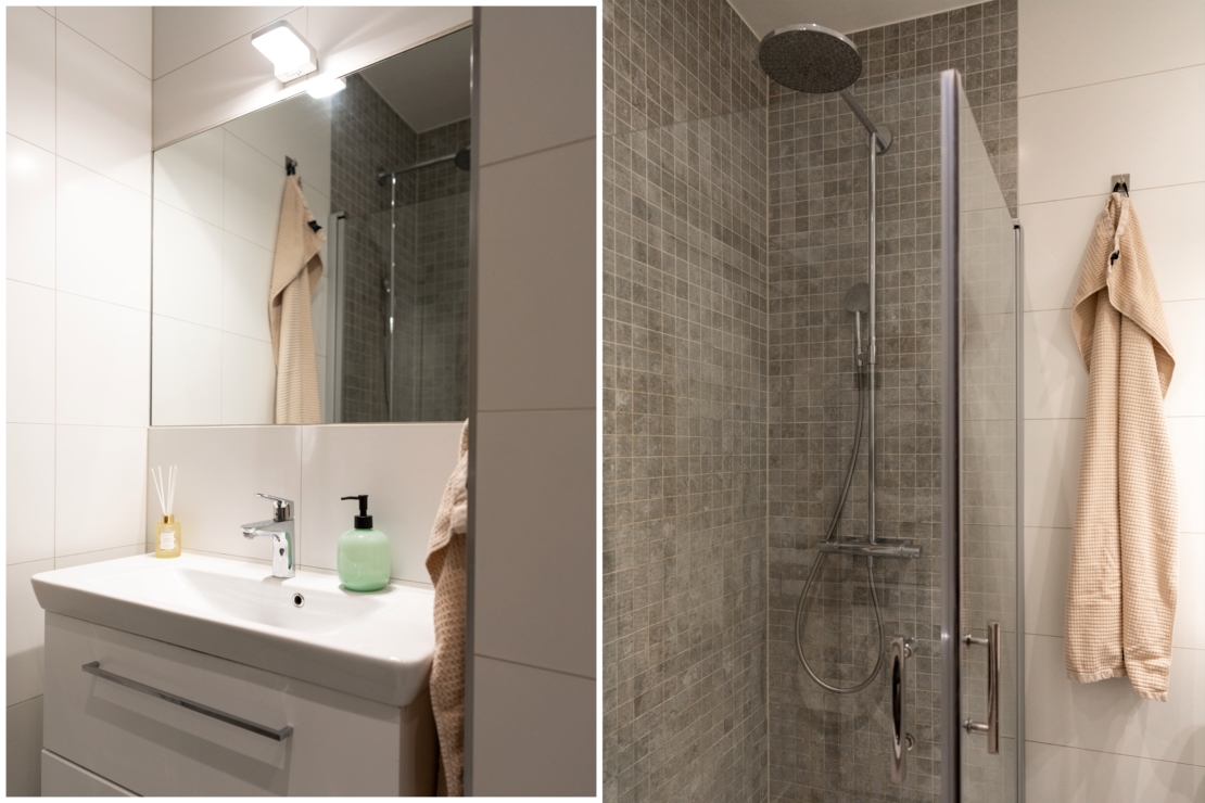 Helkaklat badrum inrett med wc, tvättställ med kommod, dusch med vikbara glasväggar samt tvättmaskin och torktumlare. Förvaring i spegelskåp och Infällda spotlights i tak.