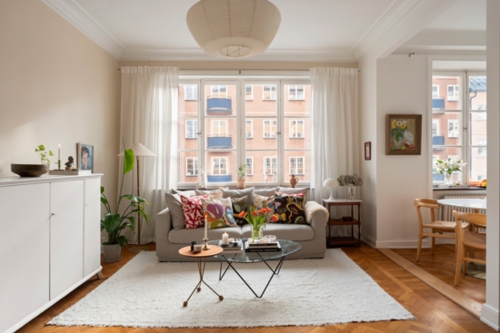 Vardagsrum med plats för soffgrupp med tillhörande möblemang. Öppen planlösning mot kök.