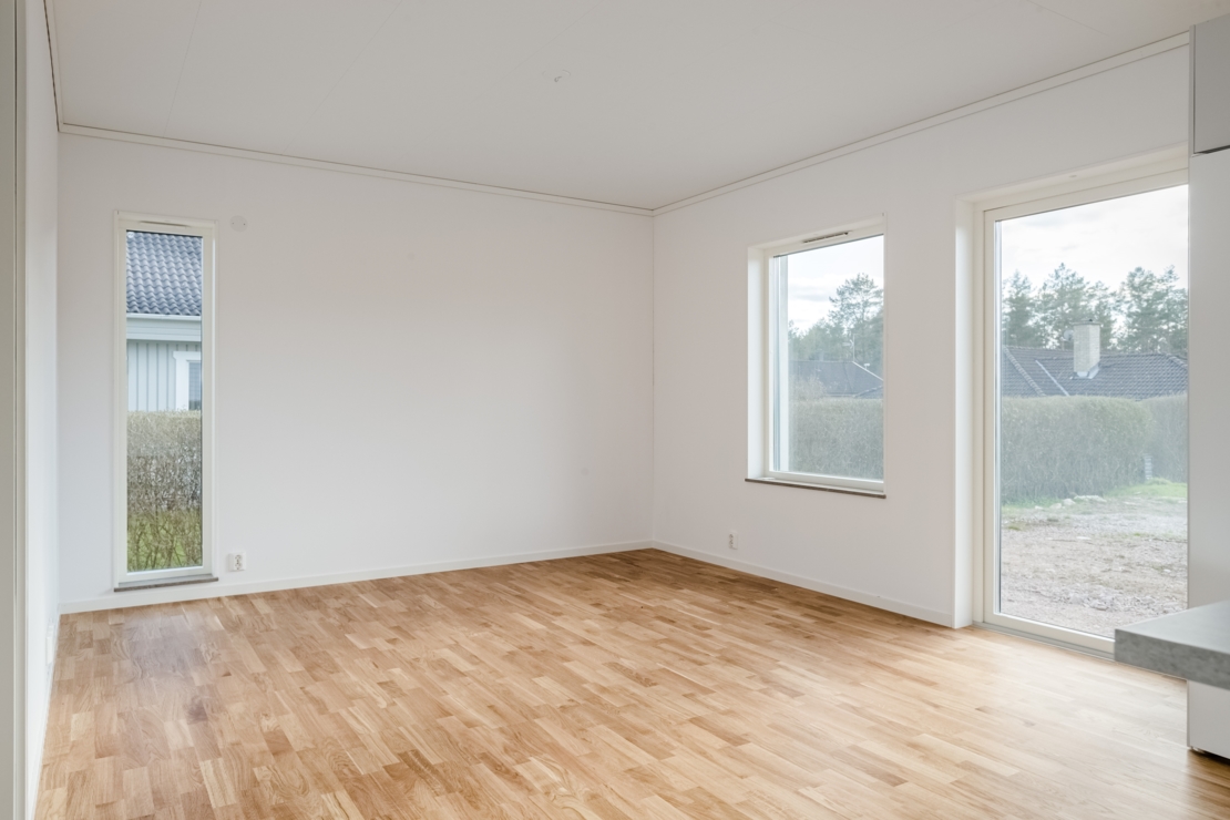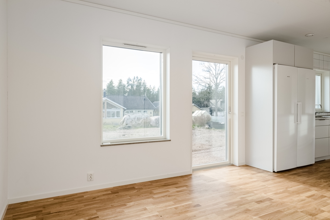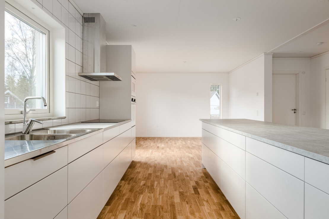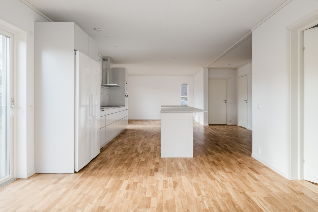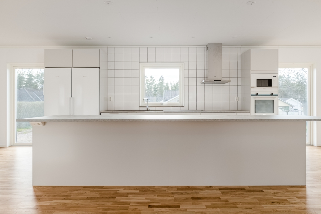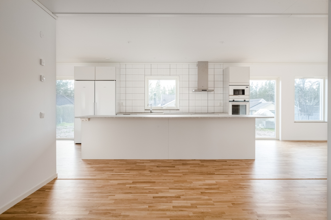 Det första ni möts av är husets hjärta – en smart och generös köksö från Ballingslöv. En perfekt plats för både snabbfrukostar, småkockar, mingel och läxläsning. På entrévåningen är planlösningen öppen, vilket ger en god överblick. Om barnen leker i trädgården hittar man dem snabbt från köket och vardagsrummet, där fönstren täcker husets alla sidor. Från köket finns även en utgång till trädgården. Vidare hittar vi ett stort badrum, tvättstuga och ett väl tilltaget sovrum på bottenvåningen. Övervåningen är oinredd. Här finns det utrymme för ytterligare ett till fem rum och ett badrum. Dessutom ger den höga takhöjden under ryggåsen möjlighet till ett sovloft eller en myshörna för barnen. Det bästa med detta huset är flexibiliteten och att huset kan förändras efter familjens olika behov.
