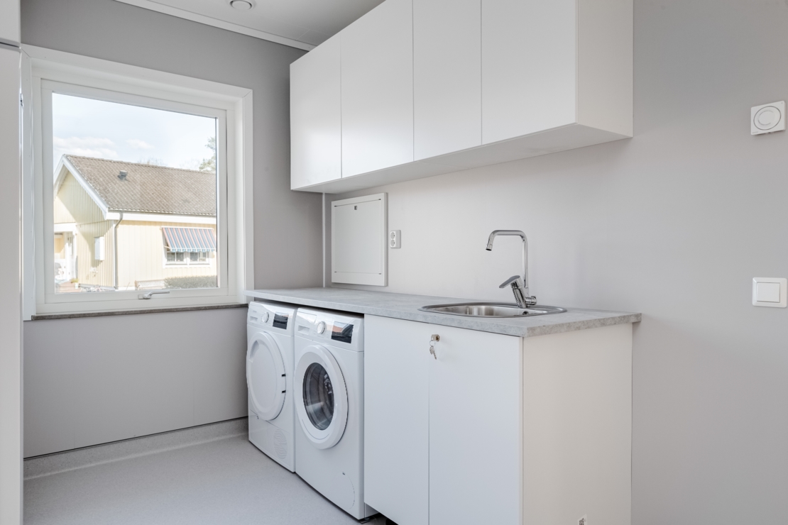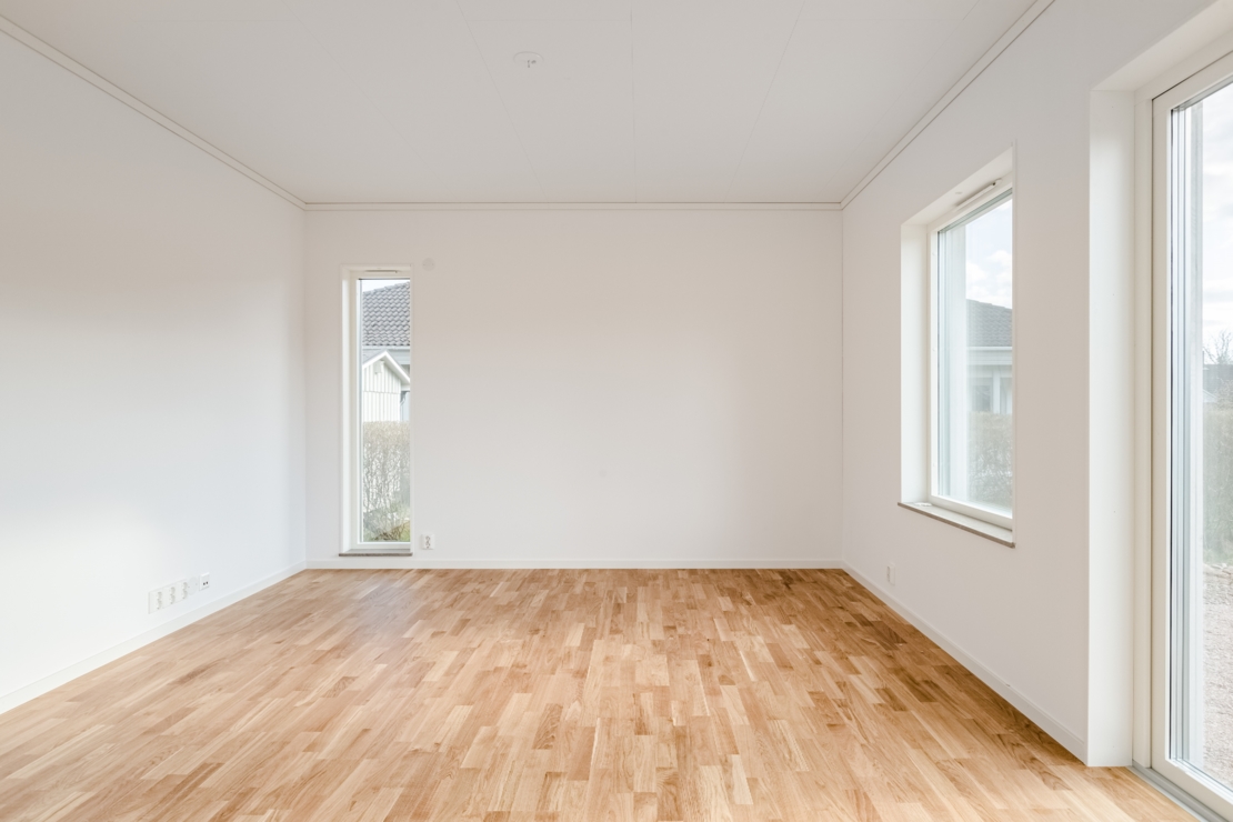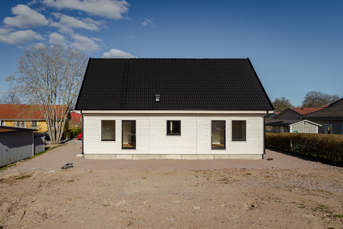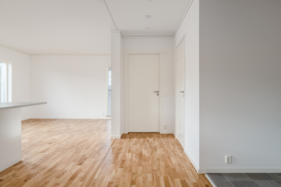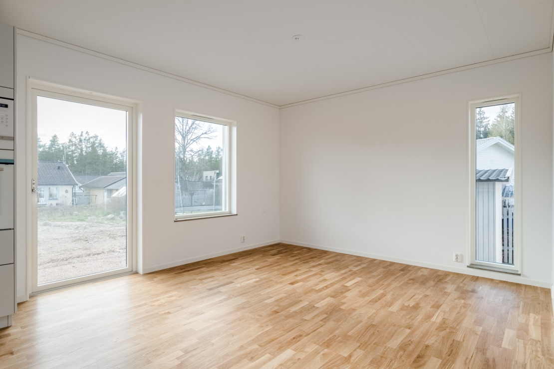 Det första ni möts av är husets hjärta – en smart och generös köksö från Ballingslöv. En perfekt plats för både snabbfrukostar, småkockar, mingel och läxläsning. På entrévåningen är planlösningen öppen, vilket ger en god överblick. Om barnen leker i trädgården hittar man dem snabbt från köket och vardagsrummet, där fönstren täcker husets alla sidor. Från köket finns även en utgång till trädgården. Vidare hittar vi ett stort badrum, tvättstuga och ett väl tilltaget sovrum på bottenvåningen. Övervåningen är oinredd. Här finns det utrymme för ytterligare ett till fem rum och ett badrum. Dessutom ger den höga takhöjden under ryggåsen möjlighet till ett sovloft eller en myshörna för barnen. Det bästa med detta huset är flexibiliteten och att huset kan förändras efter familjens olika behov.