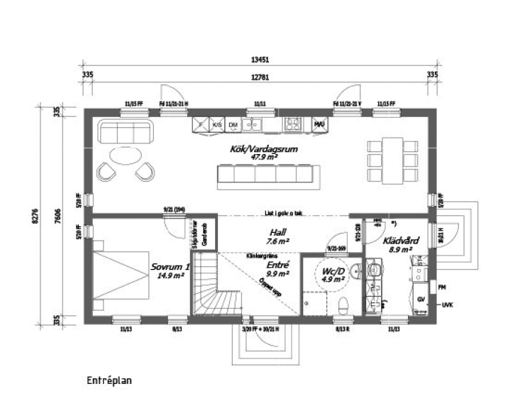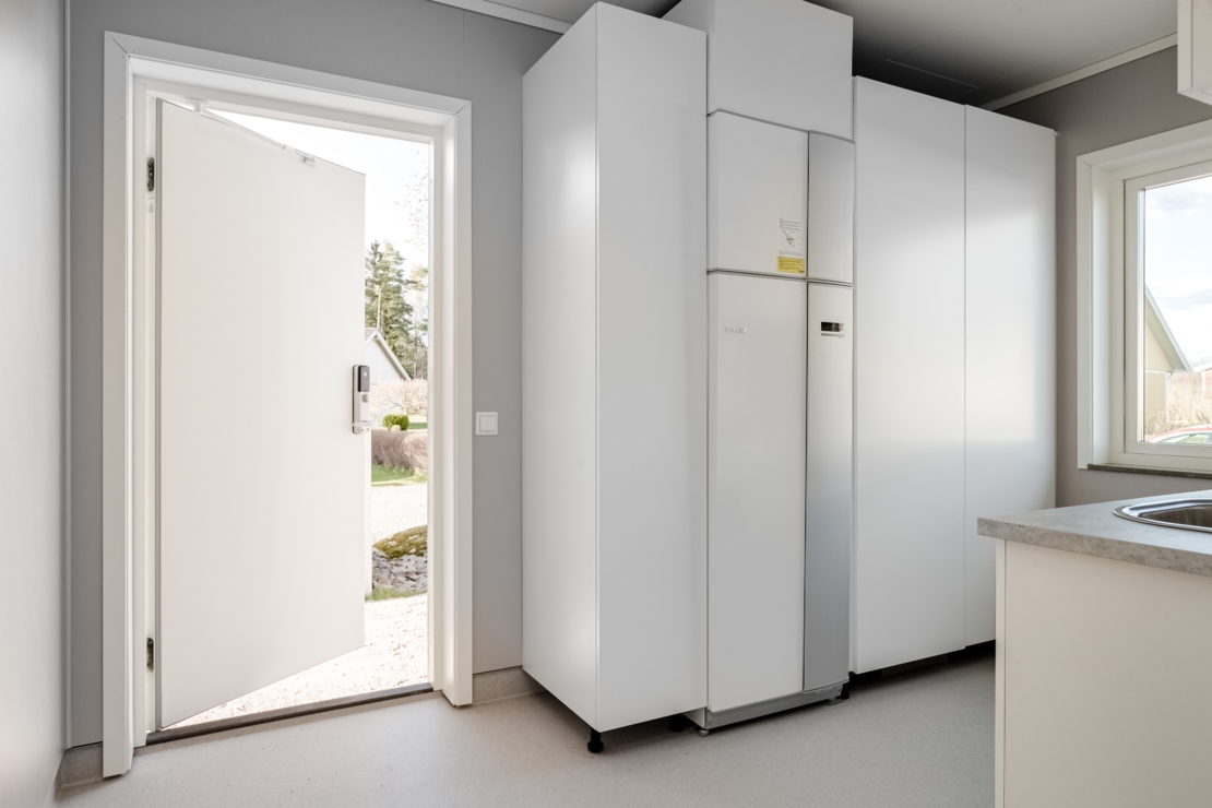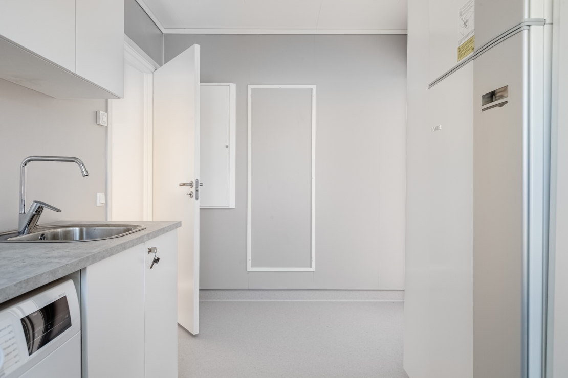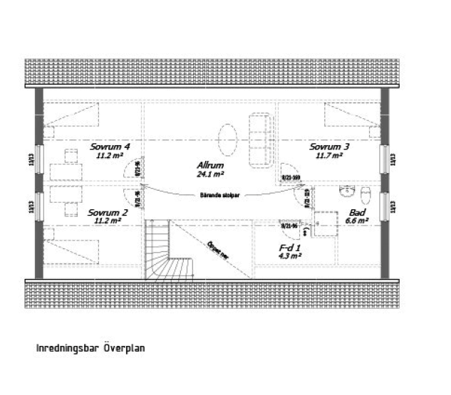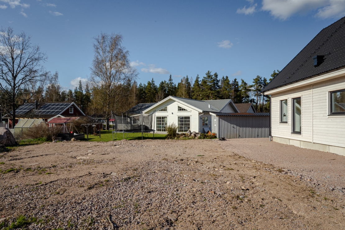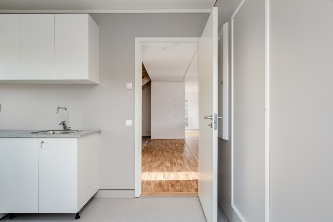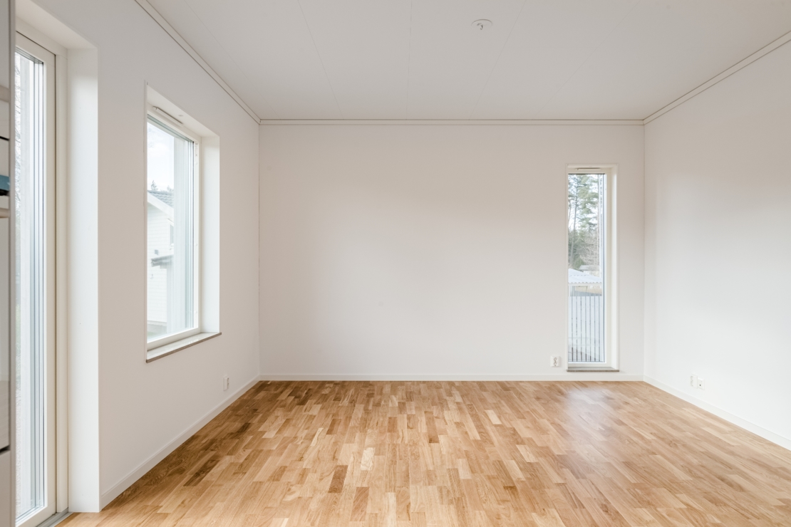 Det första ni möts av är husets hjärta – en smart och generös köksö från Ballingslöv. En perfekt plats för både snabbfrukostar, småkockar, mingel och läxläsning. På entrévåningen är planlösningen öppen, vilket ger en god överblick. Om barnen leker i trädgården hittar man dem snabbt från köket och vardagsrummet, där fönstren täcker husets alla sidor. Från köket finns även en utgång till trädgården. Vidare hittar vi ett stort badrum, tvättstuga och ett väl tilltaget sovrum på bottenvåningen. Övervåningen är oinredd. Här finns det utrymme för ytterligare ett till fem rum och ett badrum. Dessutom ger den höga takhöjden under ryggåsen möjlighet till ett sovloft eller en myshörna för barnen. Det bästa med detta huset är flexibiliteten och att huset kan förändras efter familjens olika behov.