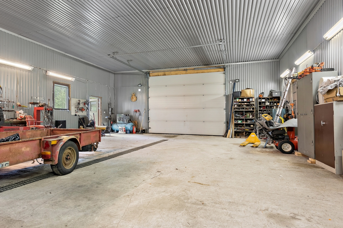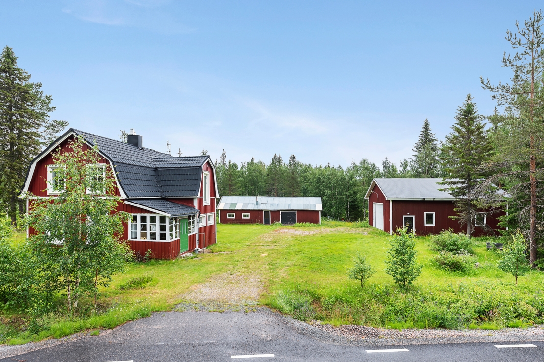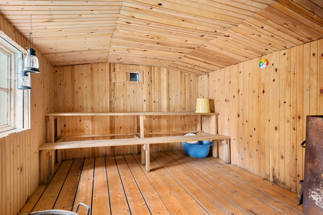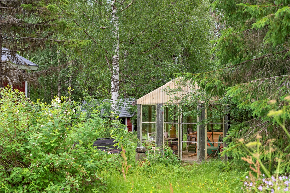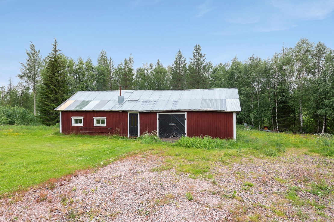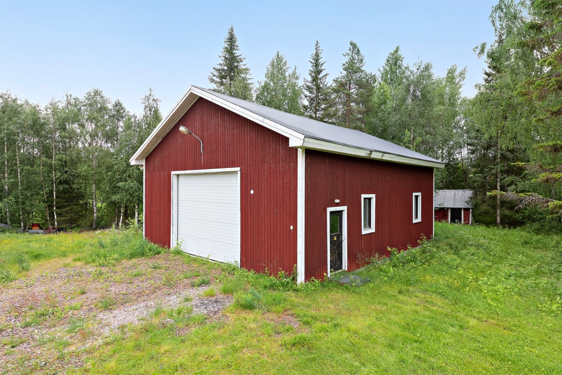 På tomten finns en 4m hög, 120 kvm stort garage/maskinhall i fräscht skick, en vedeldad utebastu, ladugård samt växthus.