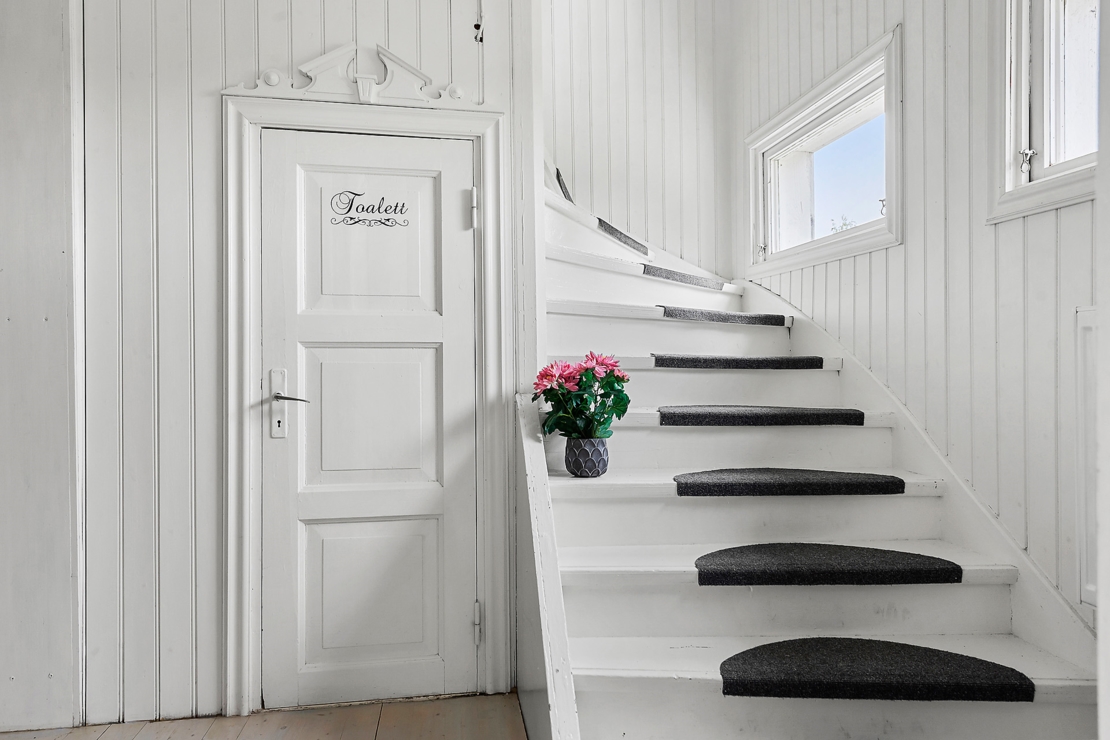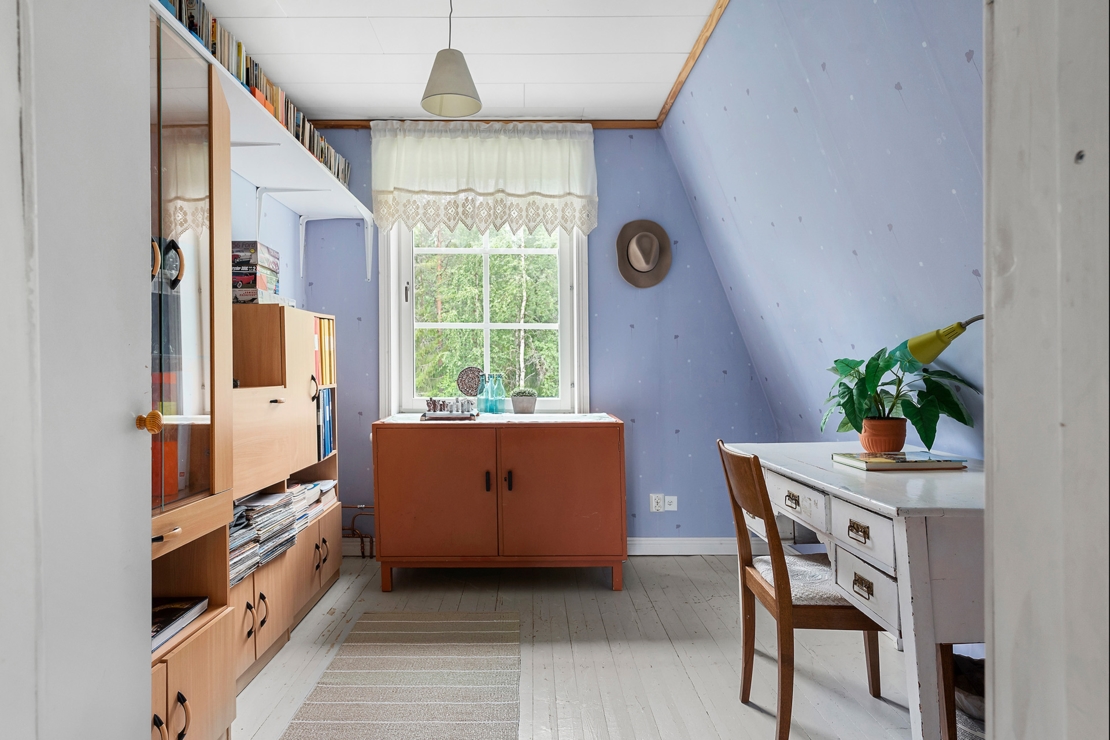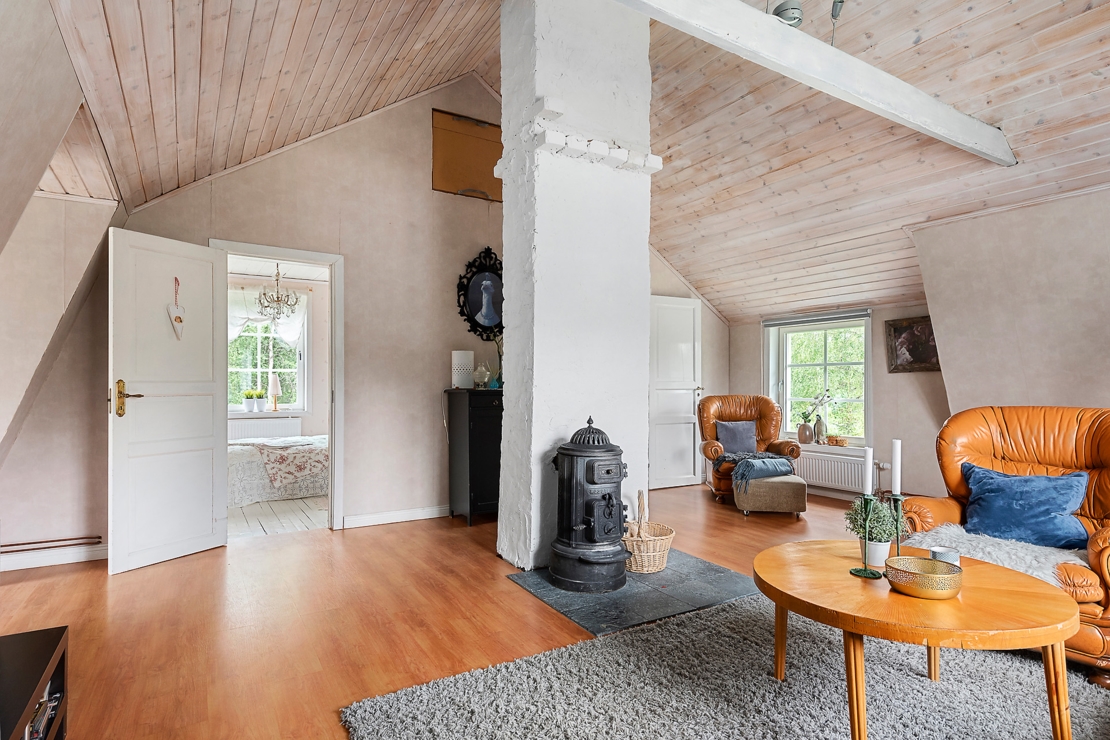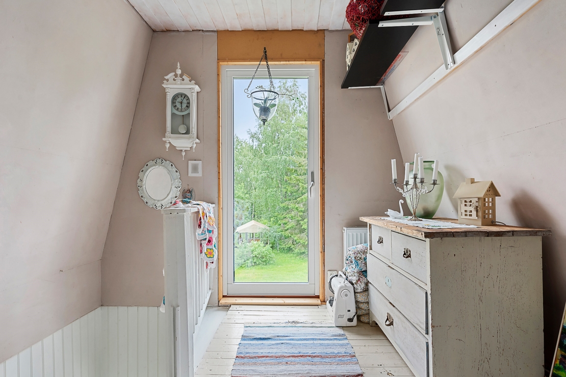 På entréplan finner man ett stort och nytt kök/allrum med vedkamin, ett sovrum, badrum med bastu, dusch och toalett. På övre plan ligger ett stort vardagsrum med högt tak och två mindre sovrum. Både från nedre och övreplanen har man vacker utsikt mot sjön.
