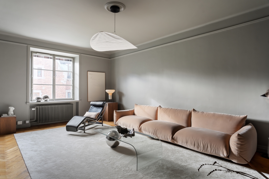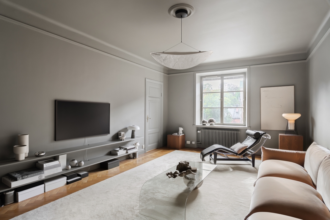 De tre rummen och köket ramas in av en inre, vacker och central yta som med fördel används som matsal. Ljuset flödar genom dubbeldörrarna som leder vidare till vardagsrum och sovrum, vilket skapar en genomtänkt symmetri och en härlig känsla av rymd. Här dukar du upp för långa middagar, firanden eller spontana kvällar med vänner. Vardagsrummet är generöst tilltaget med vacker fiskbensparkett. Här finns plats för både soffgrupp och läshörna.